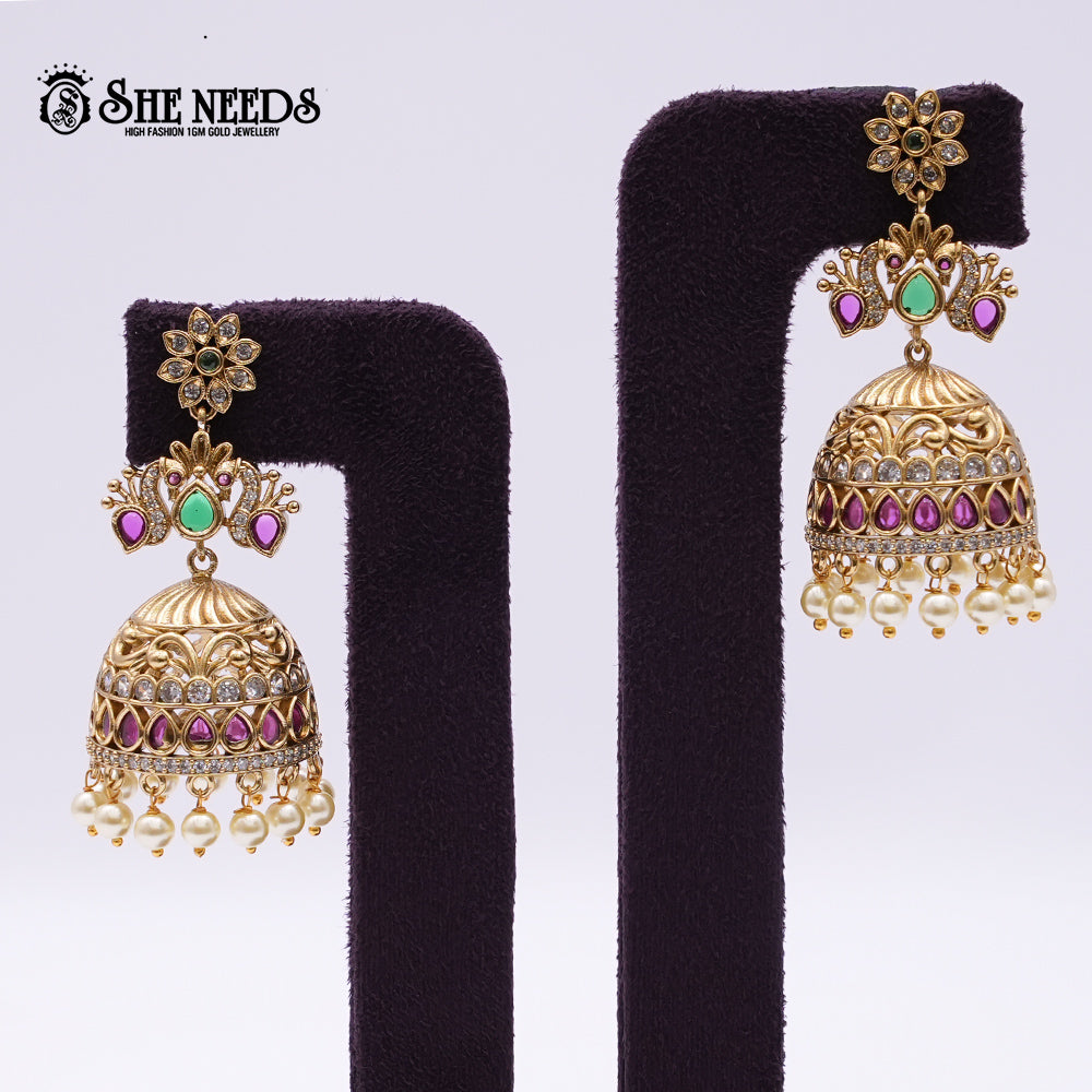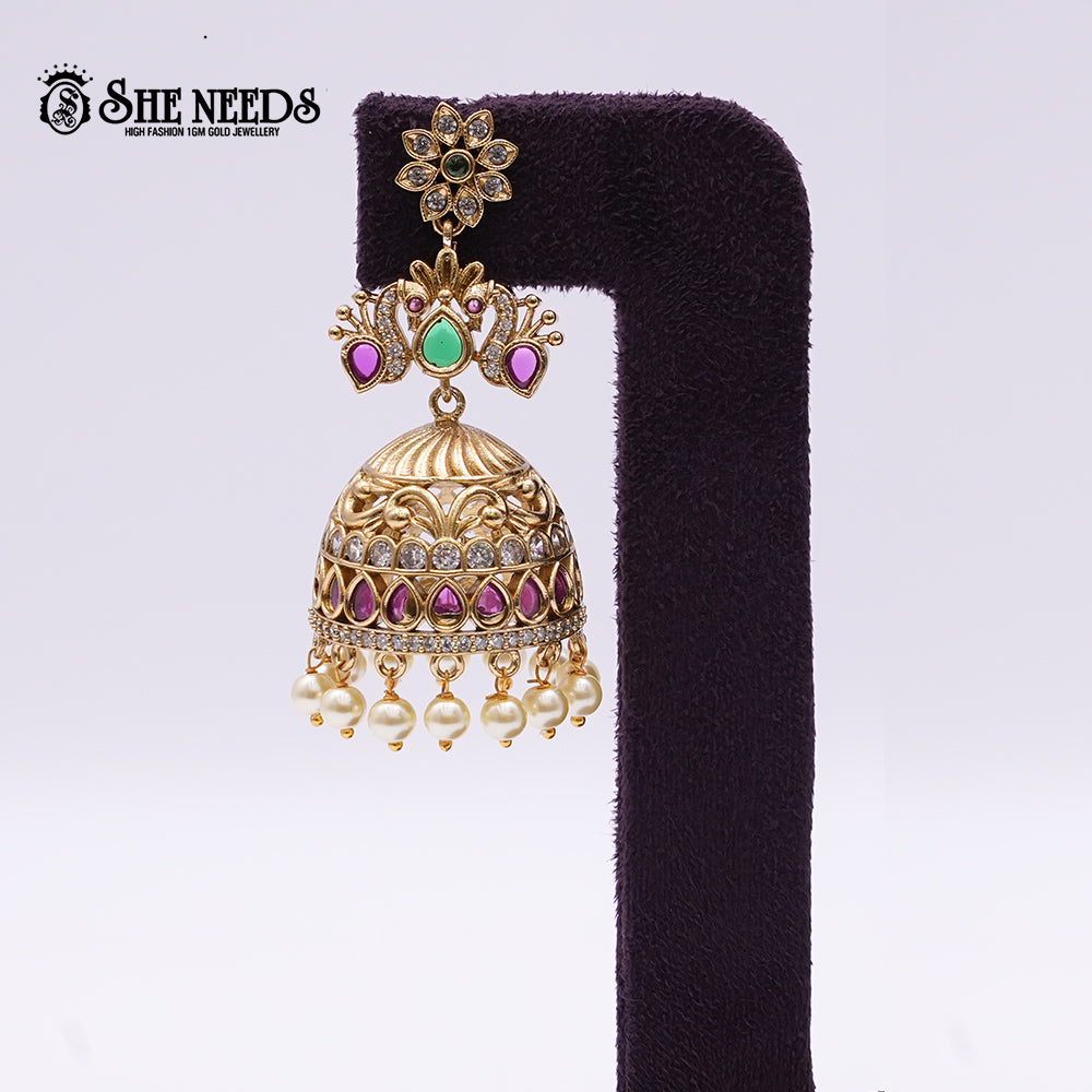 Bring a touch of regal elegance to your ethnic style with these ornate Temple Jhumka Earrings from She Needs. Featuring a floral stud and intricate fan-shaped motif set with green and magenta stones, the design flows into a beautifully carved gold dome adorned with sparkling CZ stones and rich magenta accents. The jhumkas are completed with lustrous pearl danglers, adding grace and movement. Perfect for bridal wear, festive occasions, and classical dance ensembles, these earrings blend heritage design with timeless sophistication.