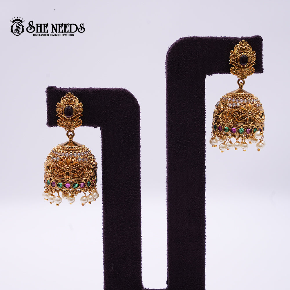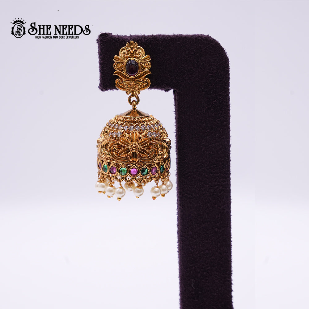 Adorn your festive look with these stunning Temple Jhumka Earrings from She Needs. Featuring intricate floral carvings and temple-style craftsmanship, the design is enriched with rows of sparkling CZ stones and vibrant green and magenta synthetic stones. The ornate gold dome is finished with lustrous pearl danglers, adding movement and elegance. Perfect for weddings, traditional celebrations, and classical dance attire, these jhumkas embody antique grandeur with timeless appeal.