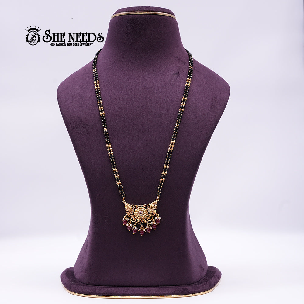 Design: Double-strand mangalsutra with floral and peacock motifs
