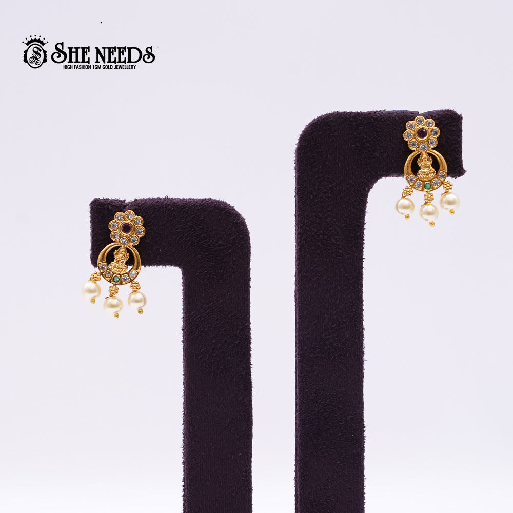 These matching Antique Gold Lakshmi Temple Earrings from She Needs blend divine symbolism with exquisite detailing. Featuring small Lakshmi engravings and pearl hangings, they add grace to any traditional look. Pair them with the matching necklace or wear them solo for a spiritual ethnic charm.