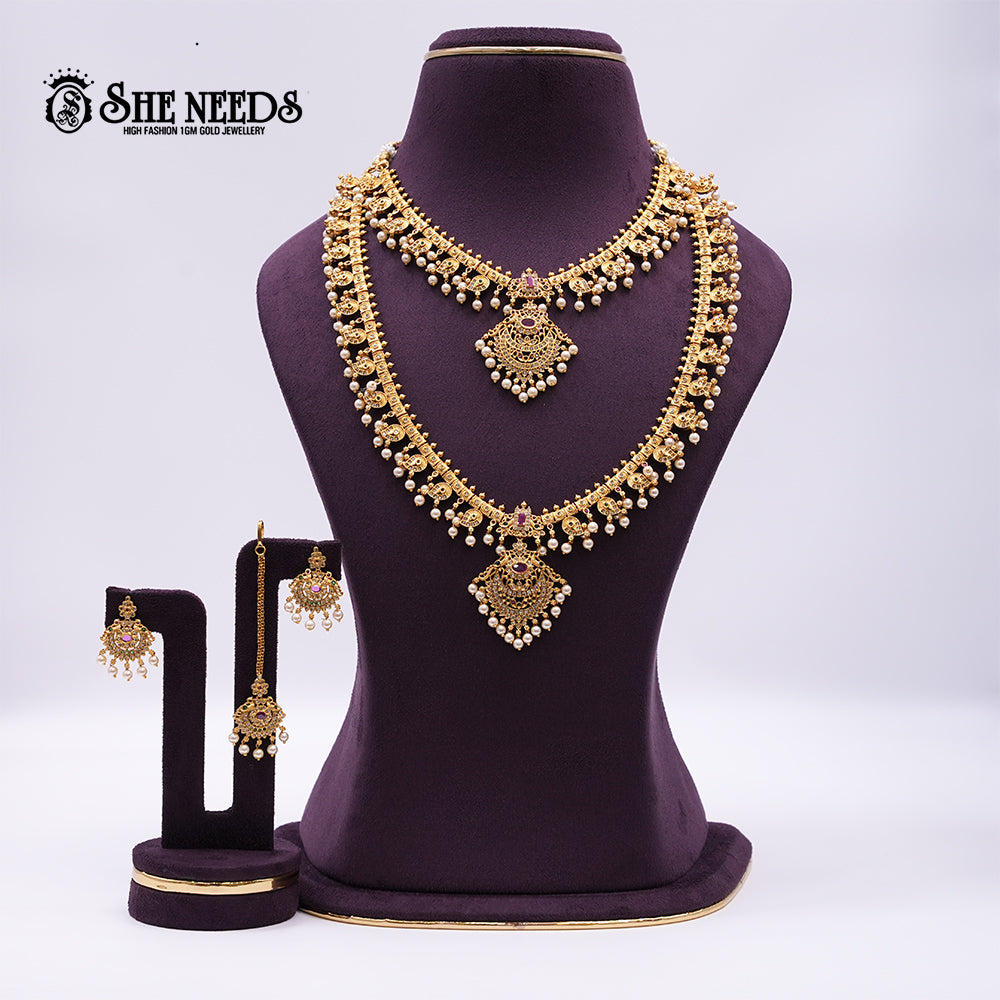 Product Name: Antique Gold Layered Pearl & Ruby Stone Bridal Necklace Set
