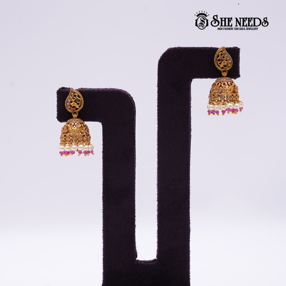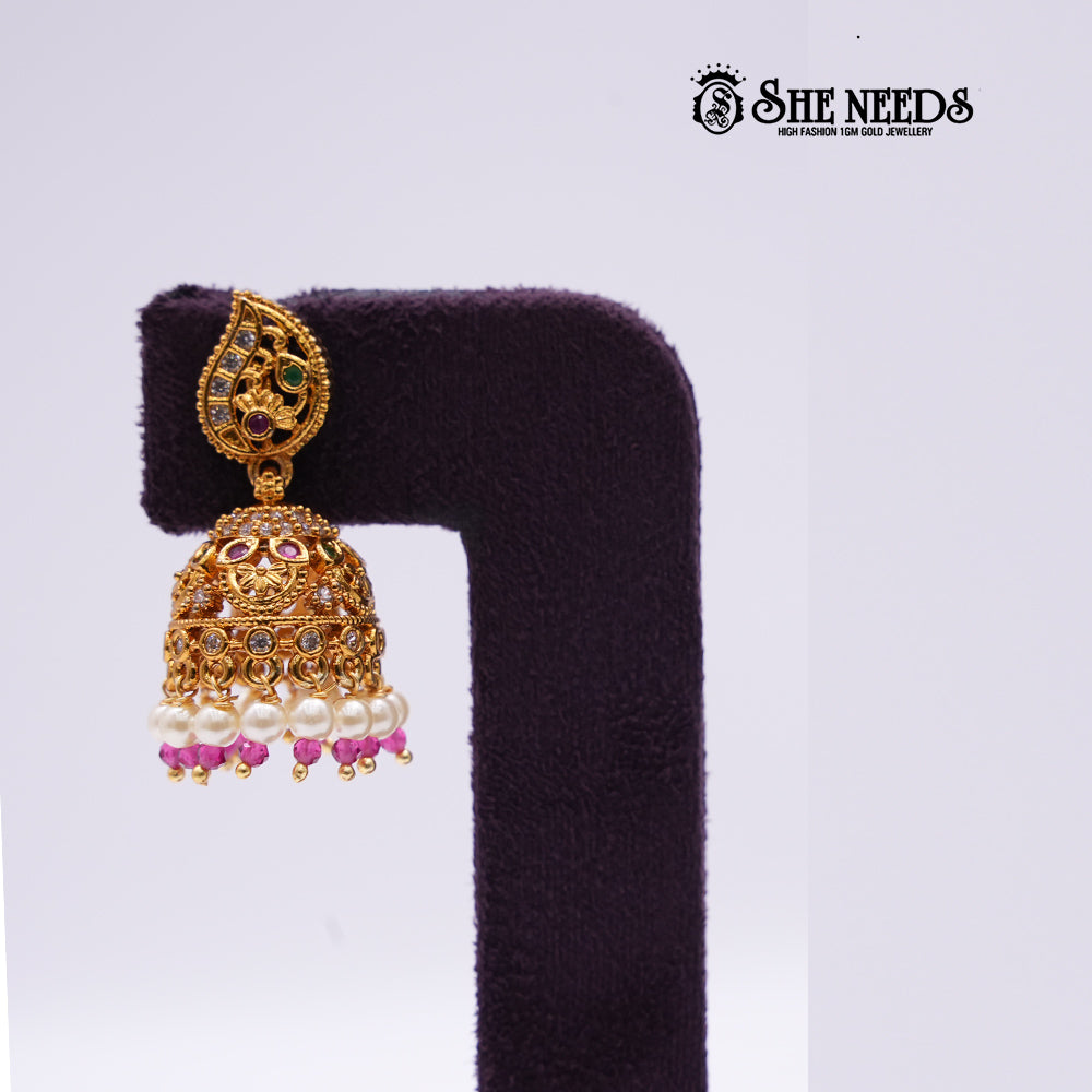 Product Name: Antique Gold Paisley Top Jhumka Earrings with Pearl & Pink Beads