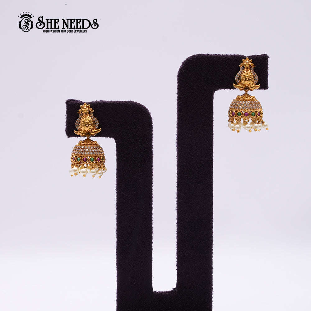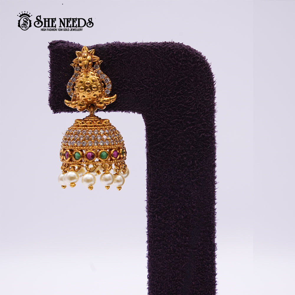 Description: Classic peacock motif jhumka earrings with multi-coloured stone accents, intricate detailing, and lustrous pearl danglers, perfect for weddings and festive wear.