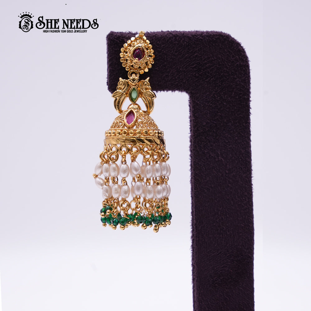 Design: Long jhumka with dual peacock motifs