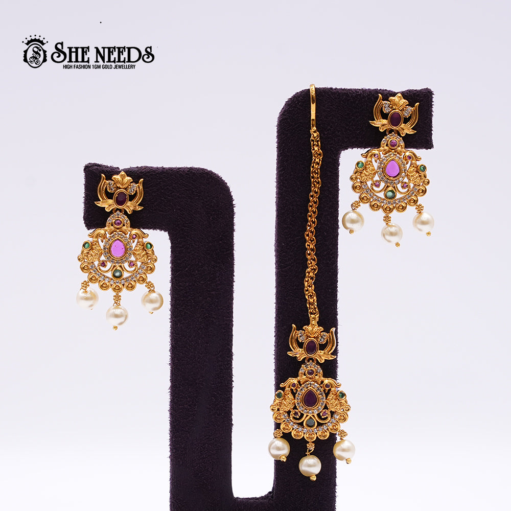 Description: Traditional jhumka earrings paired with a matching maang tikka, featuring ruby stones, pearls, and antique gold detailing — ideal for weddings and special occasions.