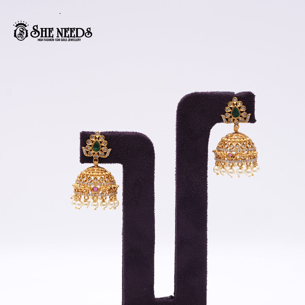 Celebrate timeless elegance with these Antique Green Stone Temple Jhumka Earrings from She Needs. Designed with intricate temple-inspired motifs, these earrings feature a royal green stone centerpiece surrounded by shimmering white stones. The dome-shaped jhumkas are adorned with delicate pearl danglings, giving them a rich traditional charm. Perfect for weddings, temple visits, and festive occasions.