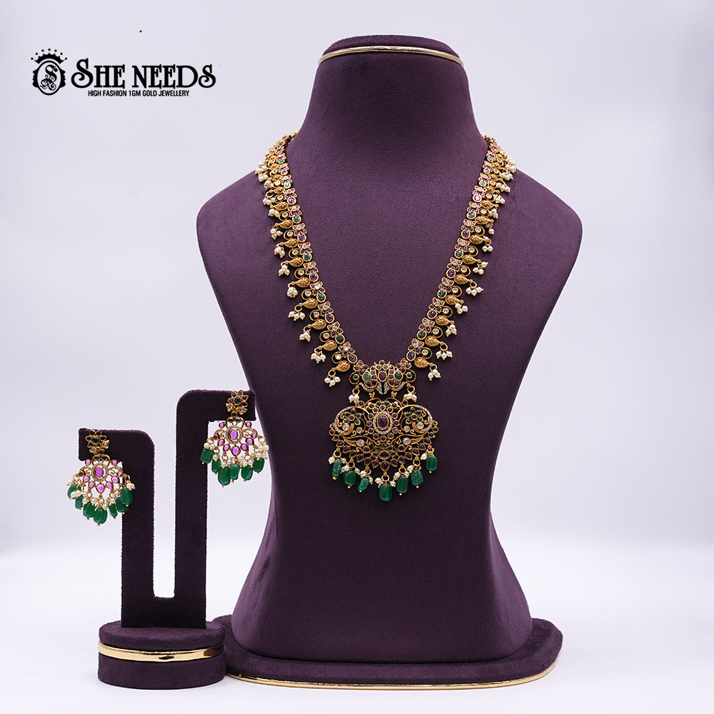 Product Name: Antique Temple Long Necklace Set with Green Drops & Pearl Accents