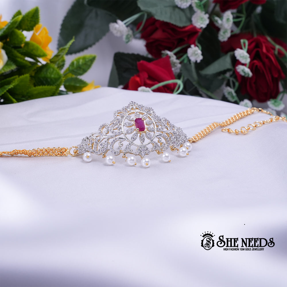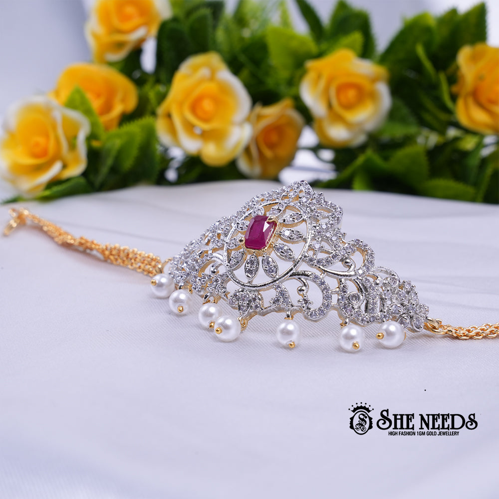 The Regal Ruby Pearl Bracelet is a celebration of sophistication and heritage charm. Featuring a dazzling floral-inspired centerpiece, it is encrusted with shimmering white stones and crowned with a radiant ruby-red gem at its core. The delicate pearl danglers add an ethereal touch, while the golden adjustable chain ensures comfort and versatility. Perfect for weddings, festive events, or evening soirees, this bracelet embodies timeless beauty with a royal finish.