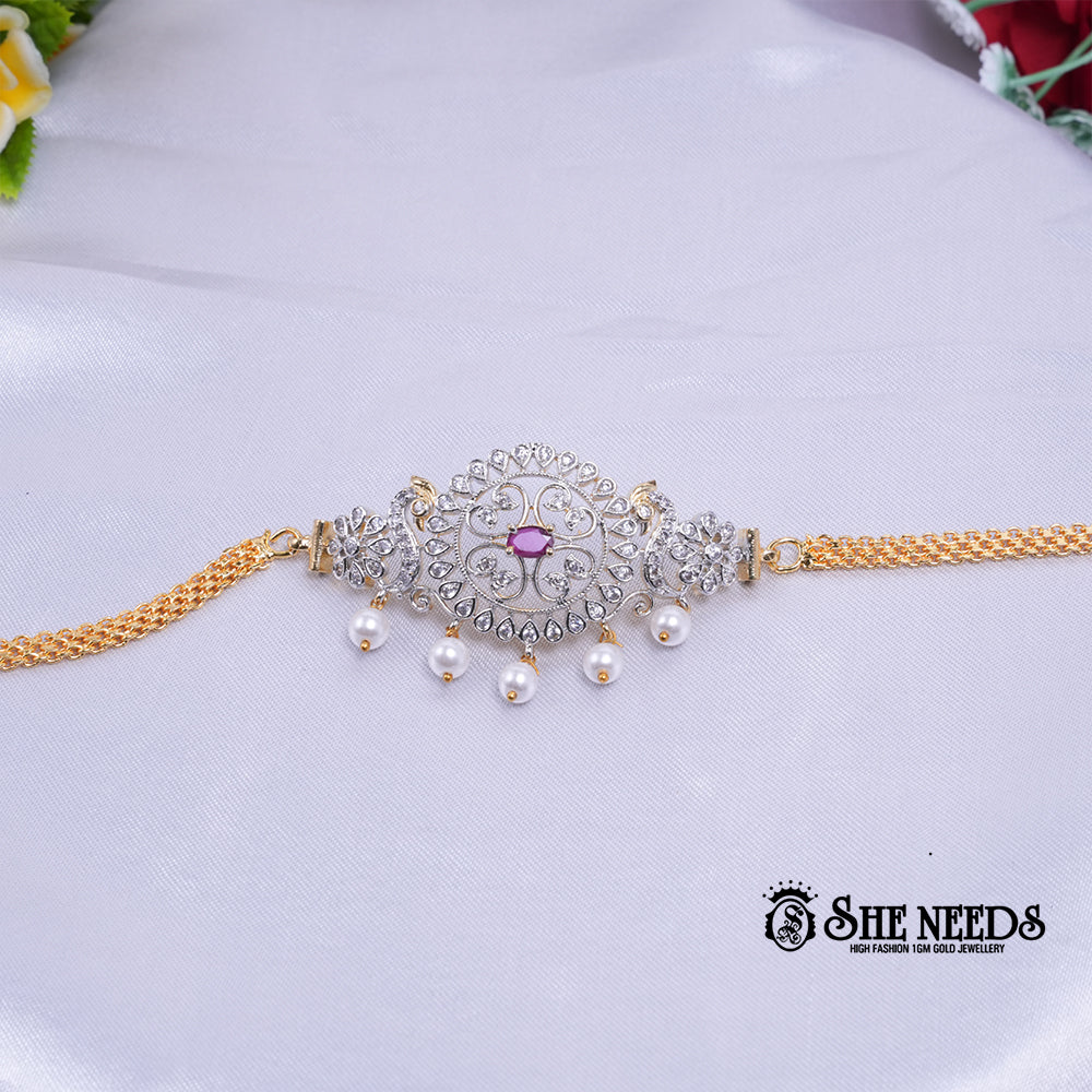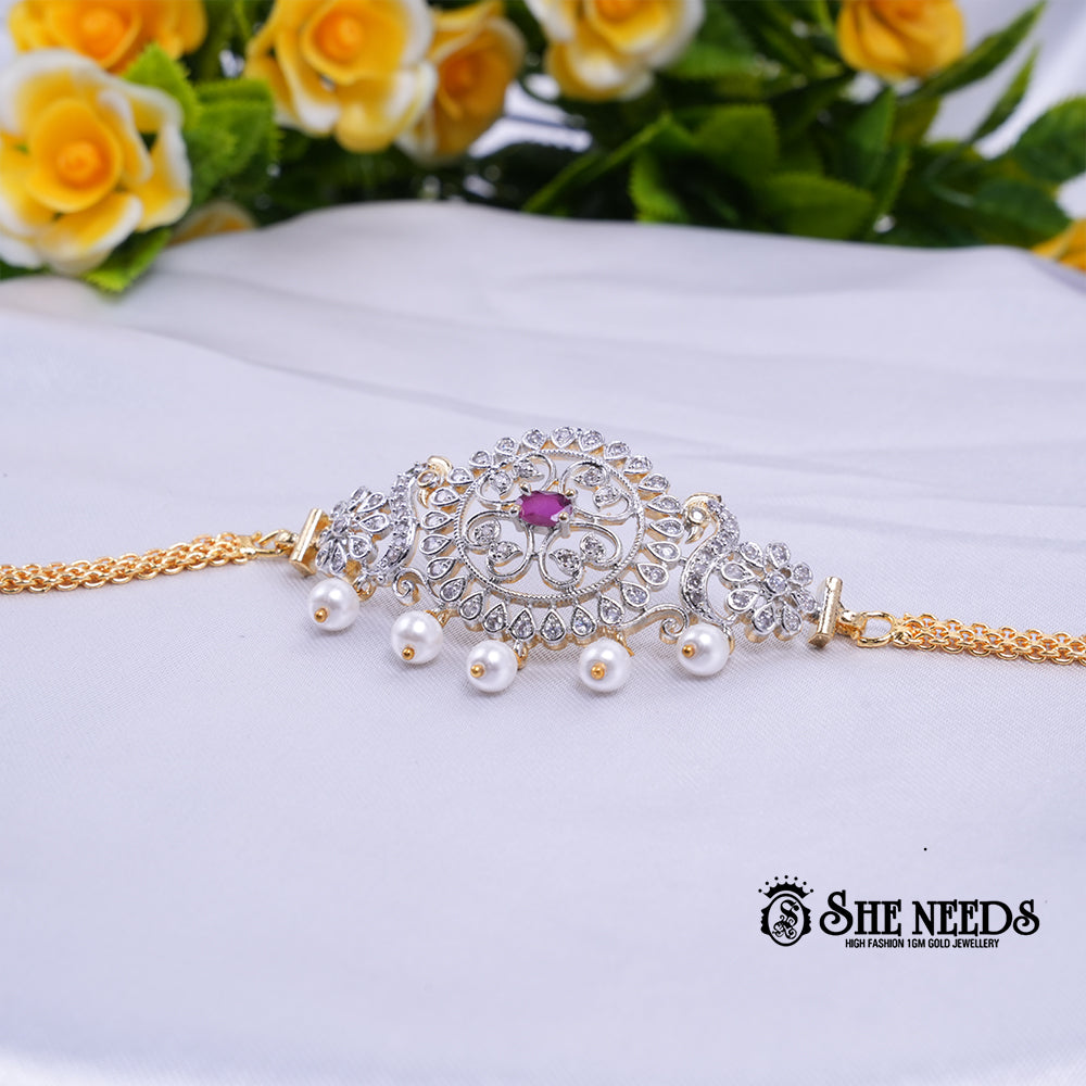 The Celestial Grace Pearl Bracelet exudes divine elegance and regal charm. Showcasing a beautifully detailed circular centerpiece adorned with brilliant white stones, it is crowned by a vivid ruby-hued gem at the center. Suspended below are luminous pearl droplets that sway gracefully with every movement. Crafted with a rich golden adjustable chain, this bracelet is a perfect blend of tradition and modern finesse. Ideal for festive gatherings, bridal attire, or evening galas, it speaks volumes of timeless sophistication.