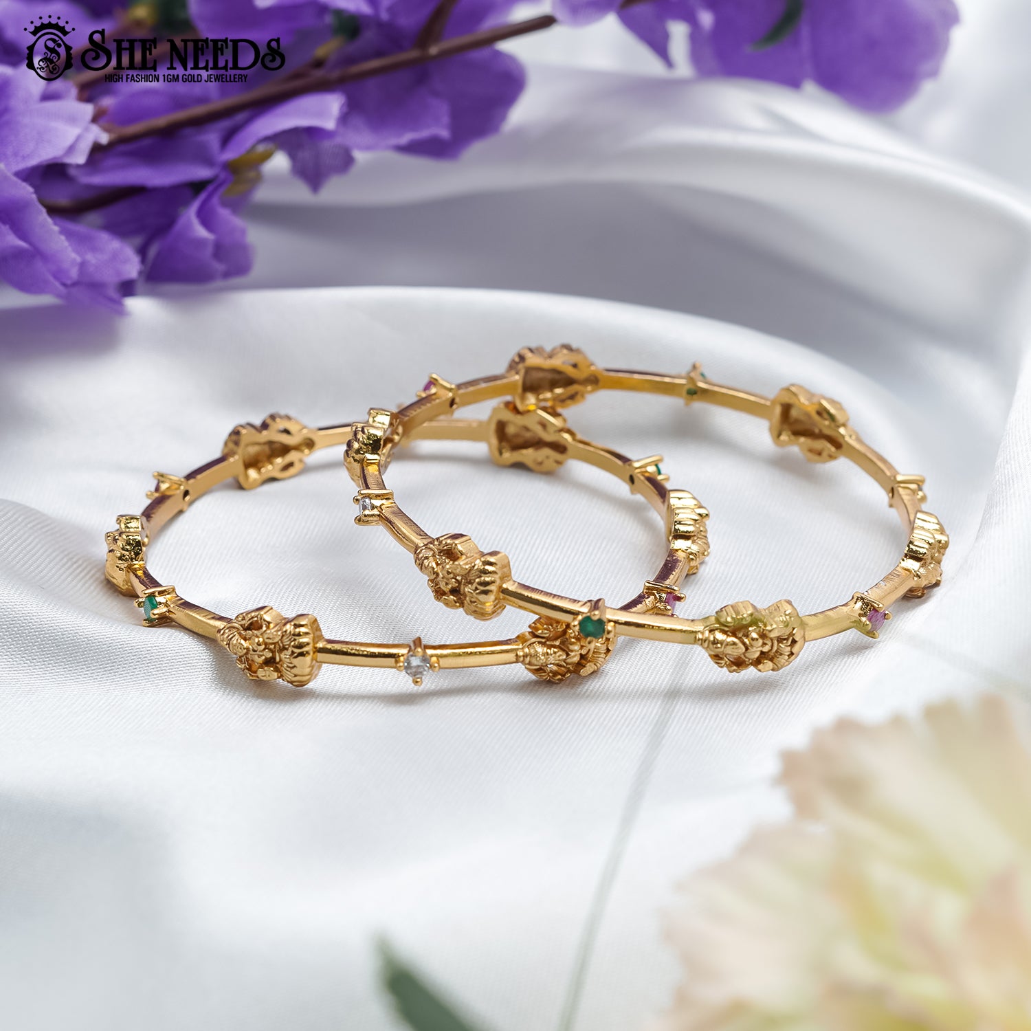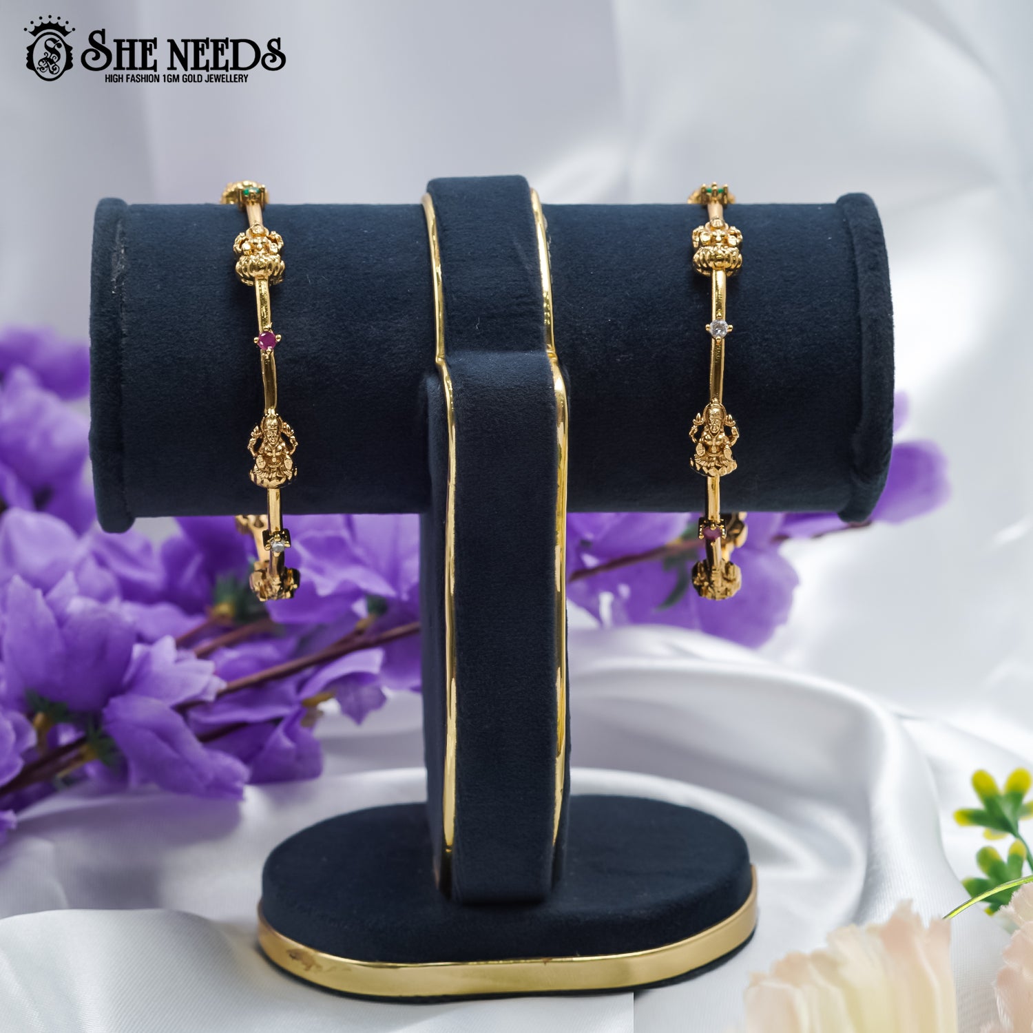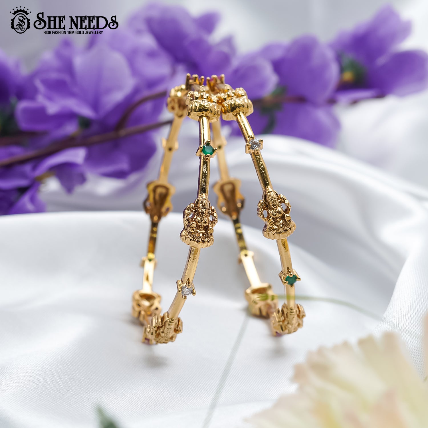 These exquisite bangles are adorned with beautifully crafted Lakshmi motifs, symbolizing prosperity and grace. Accented with colorful stones and intricate detailing, they add a regal charm to any attire. Perfect for festive occasions, weddings, or traditional gatherings, these bangles are a timeless treasure for your jewellery collection.