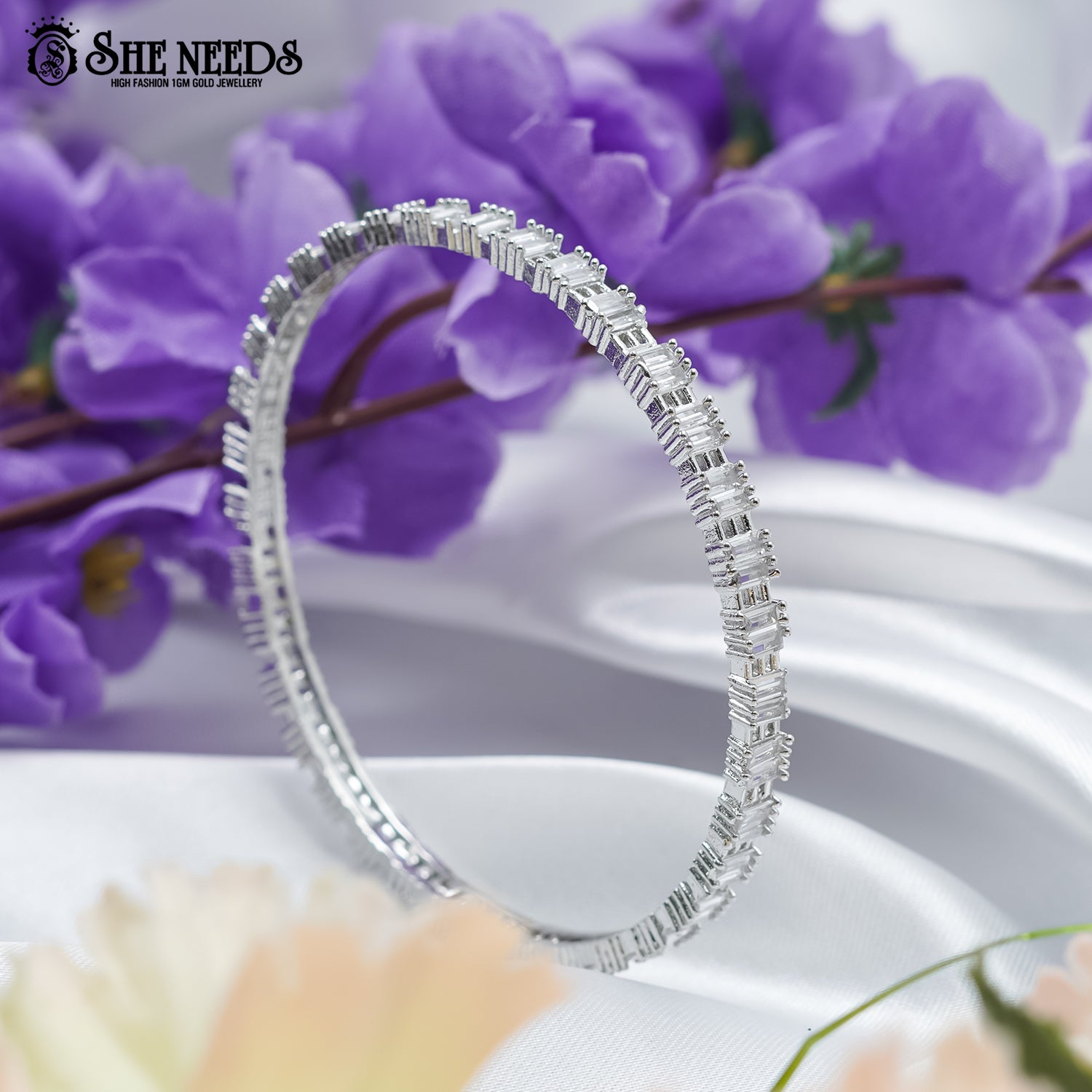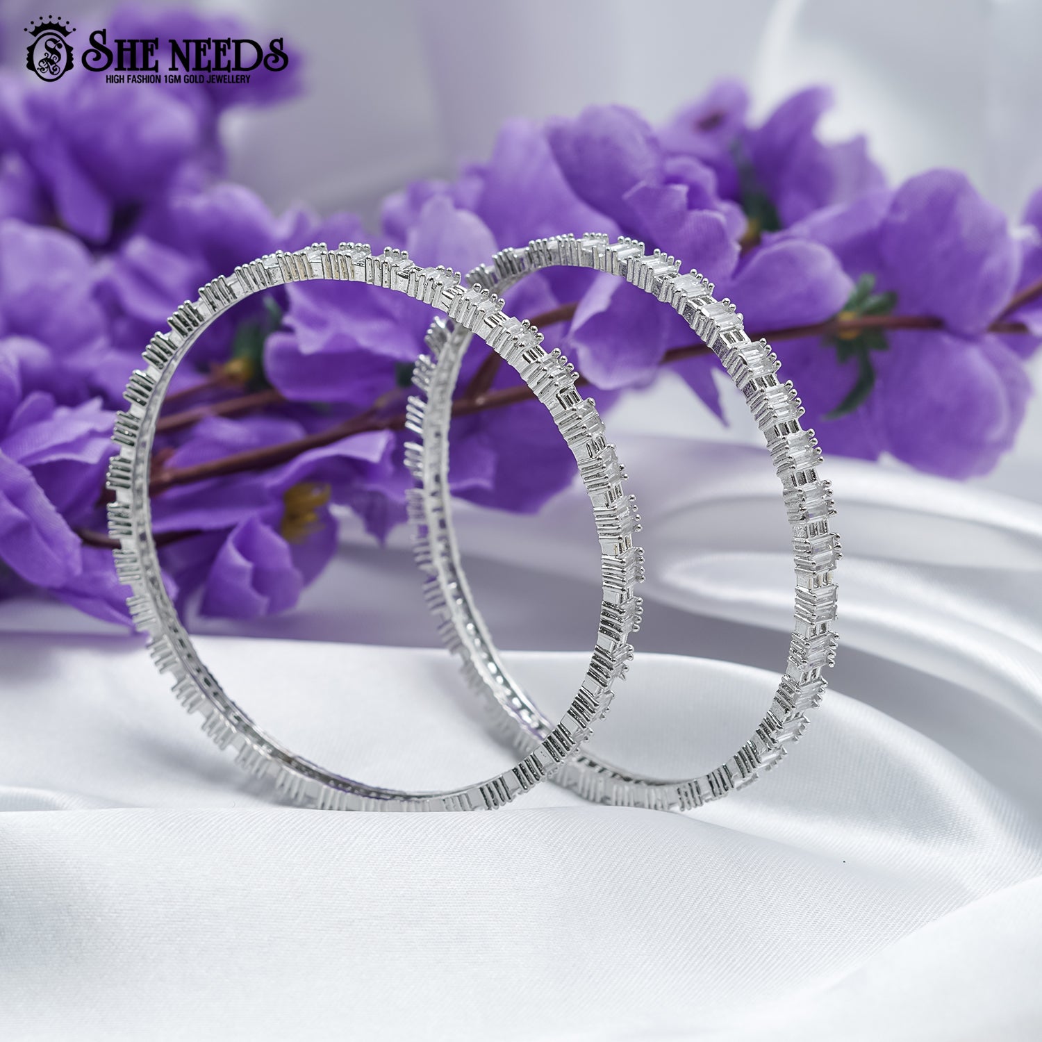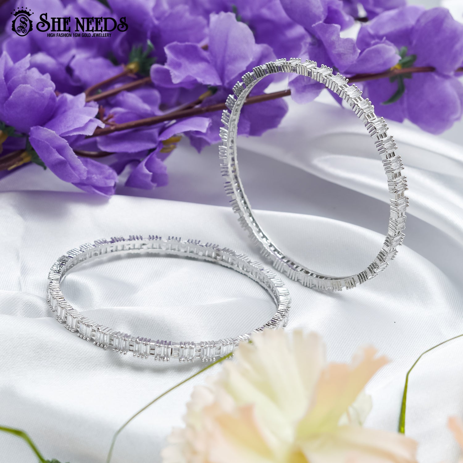 Immerse yourself in contemporary elegance with these exquisite silver bangles, meticulously crafted in a stunning baguette-cut design. Each bangle is adorned with precisely set, shimmering stones that capture and reflect light from every angle, exuding a modern allure while honoring timeless tradition. The sleek silver finish, paired with geometric artistry, makes these bangles a truly versatile and luxurious addition to your jewellery collection—perfect for celebrating special moments or elevating your everyday style.