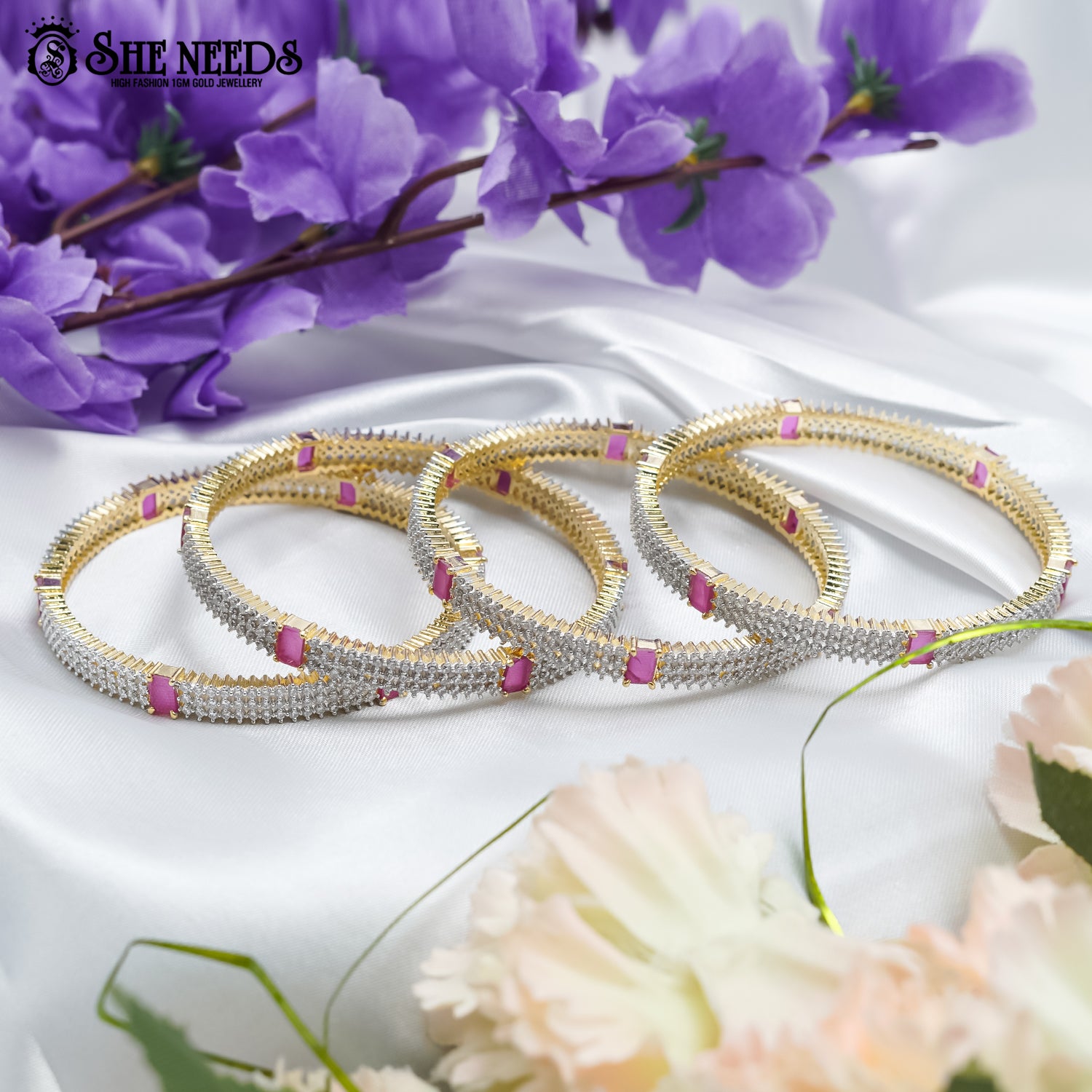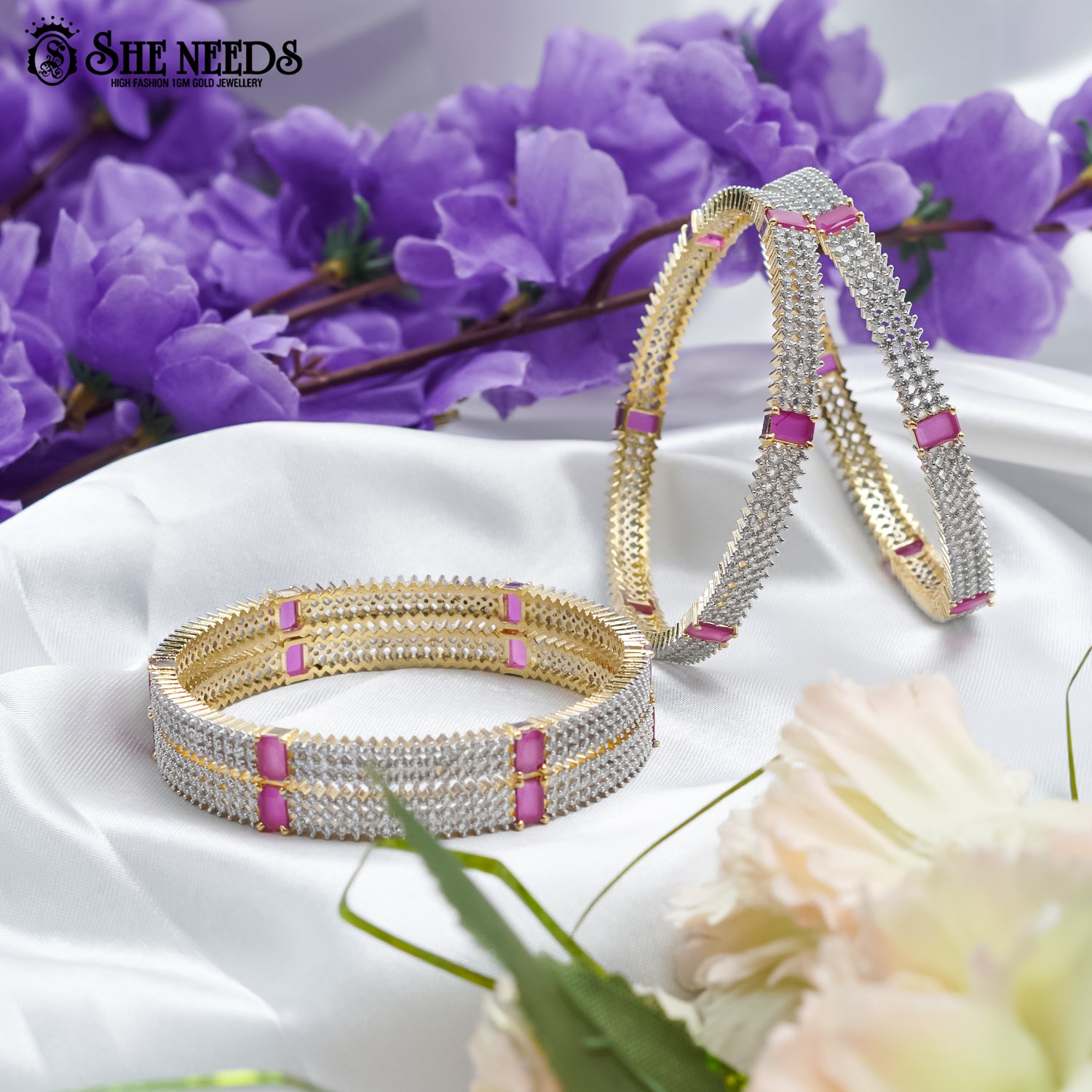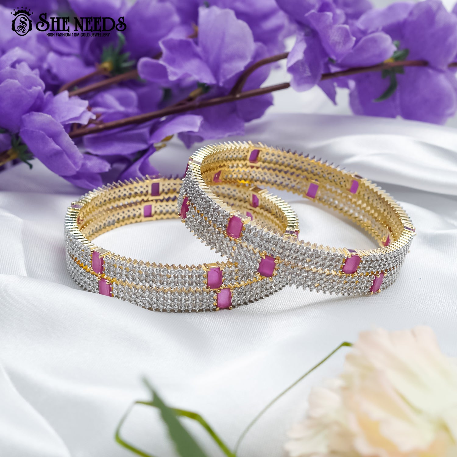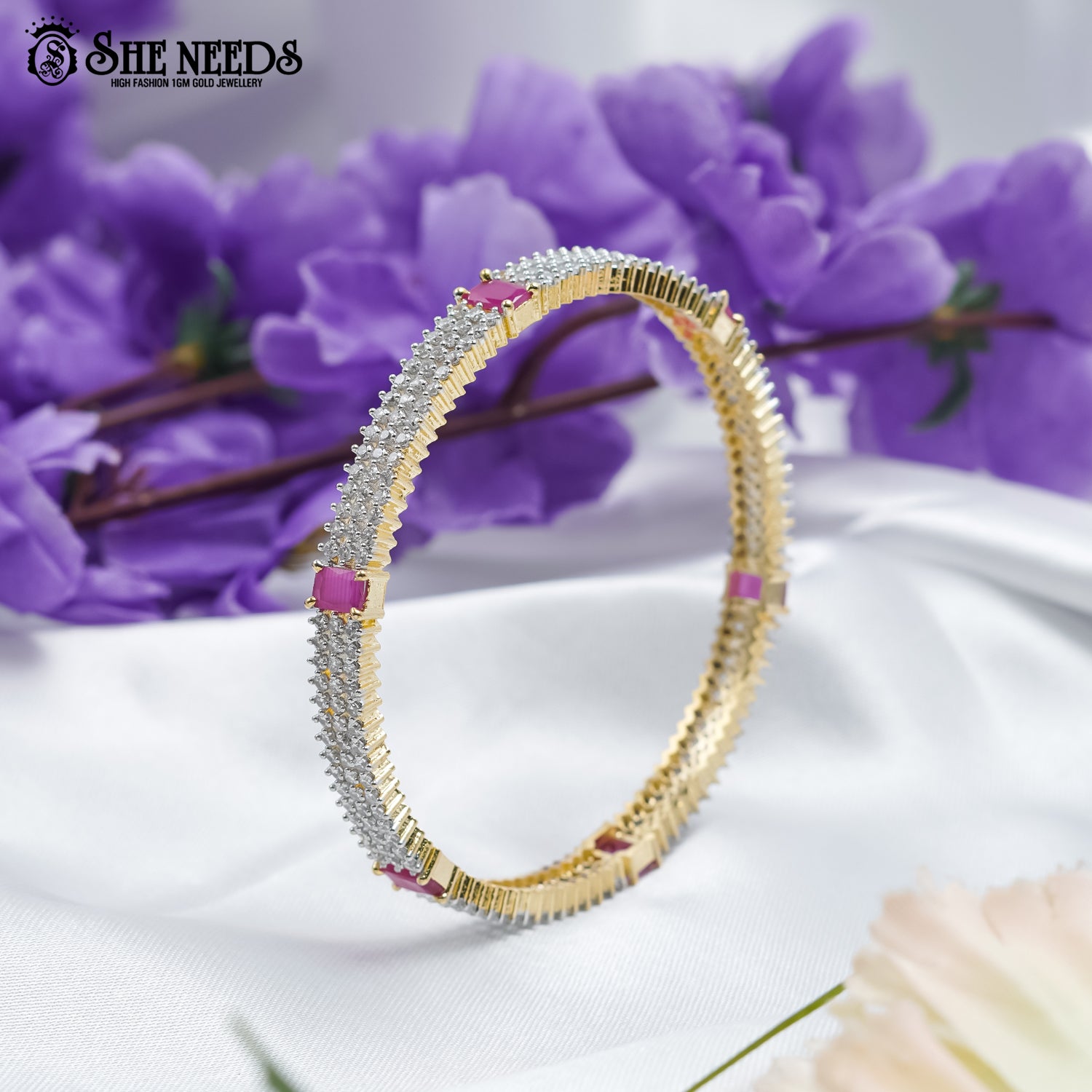 A blend of timeless tradition and modern charm, these bangles showcase radiant ruby-toned stones set in a shimmering tapestry of brilliant white stones. The elegant gold and silver dual-tone finish adds a contemporary edge, making these bangles a versatile accessory for every grand occasion.