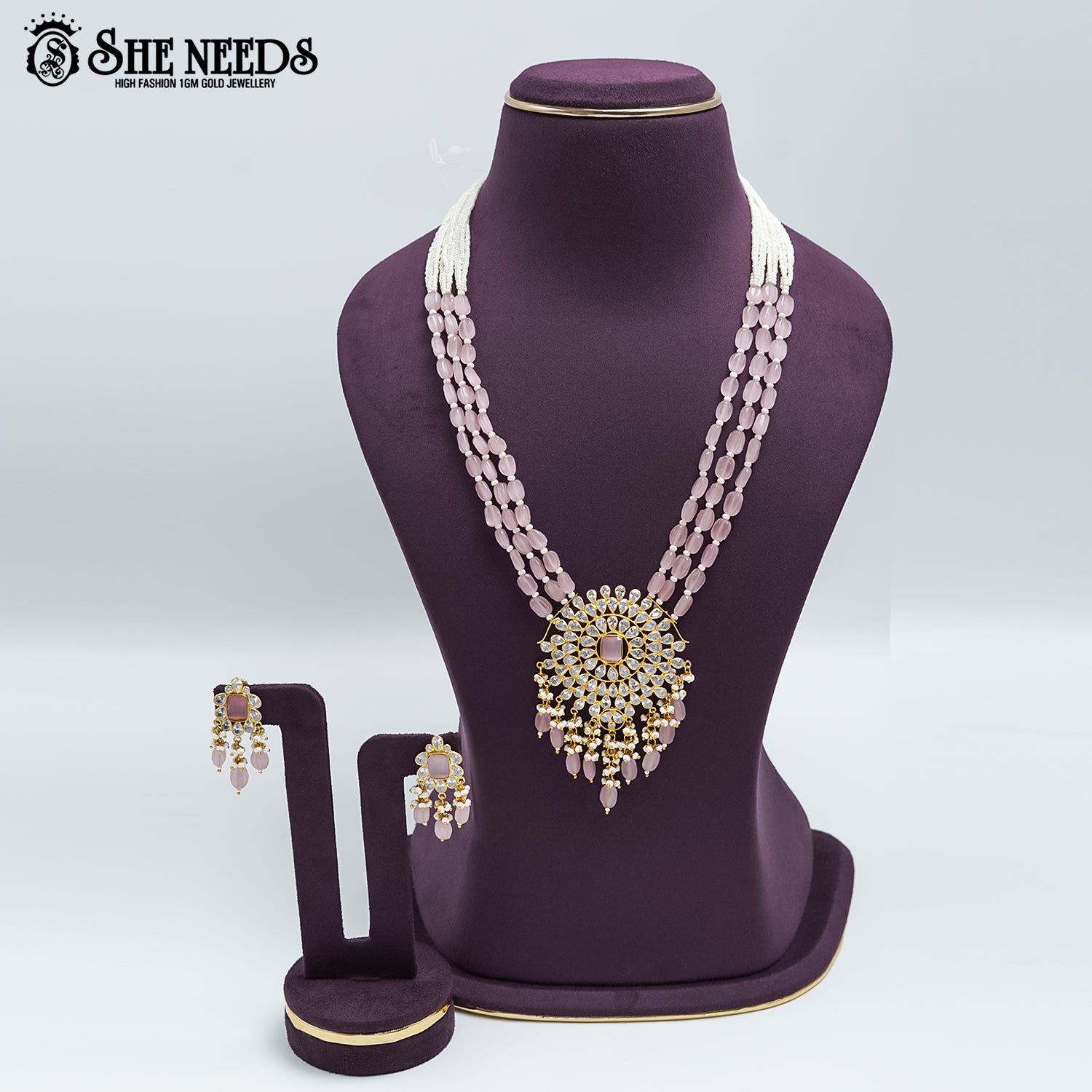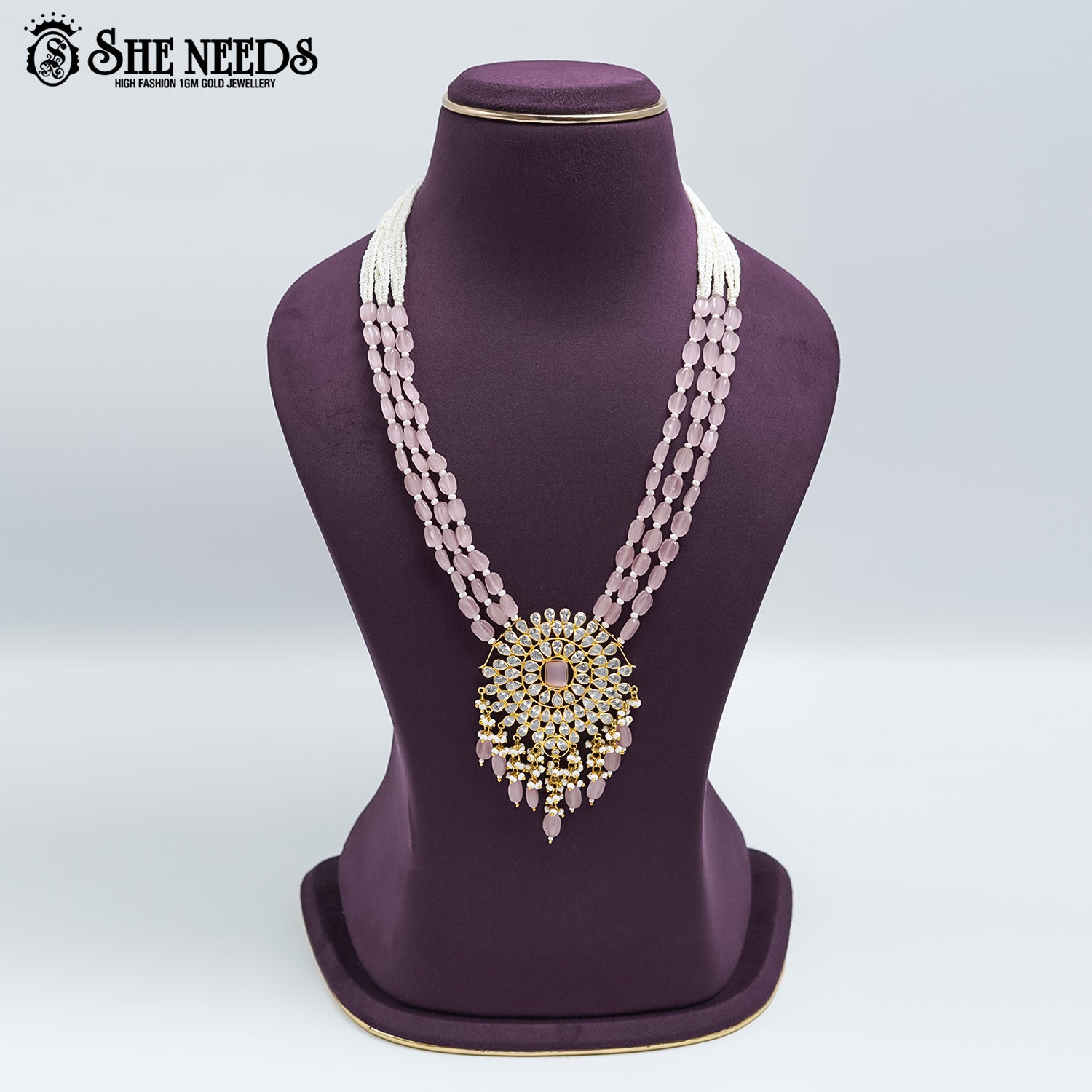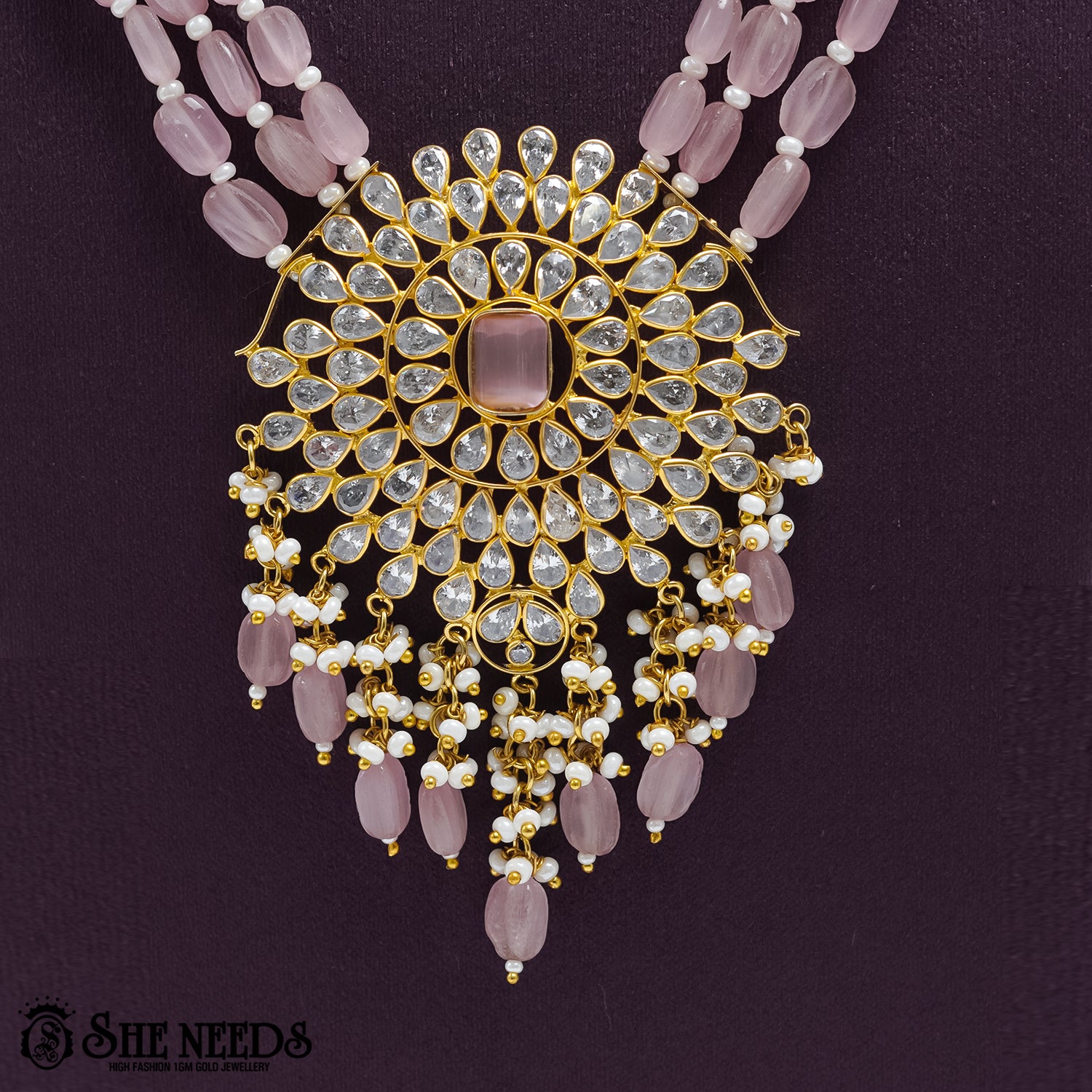 Delicate yet regal, this Blush Radiance necklace set captures timeless beauty with a soft feminine charm. Featuring a grand circular pendant embedded with brilliant kundan stones and adorned with pink beads and pearl clusters, this piece reflects luxury and grace. The necklace is crafted from multiple strands of seed pearls and soft blush-pink stones, perfect for adding sophistication to festive and wedding attire.