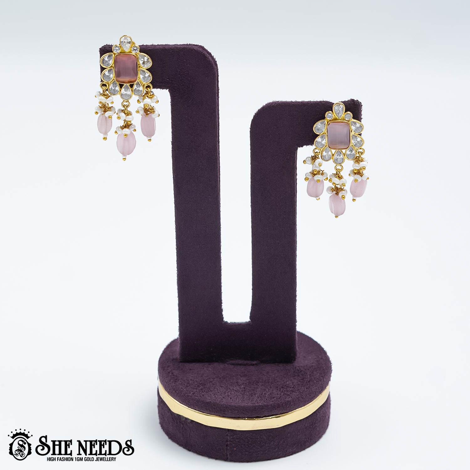 Enhance your look with these graceful chand-style earrings. Centered with a blush-pink stone, they are encircled by kundan work and finished with soft dangling pink beads and pearls. A graceful complement to the necklace or a charming standalone accessory for traditional occasions.