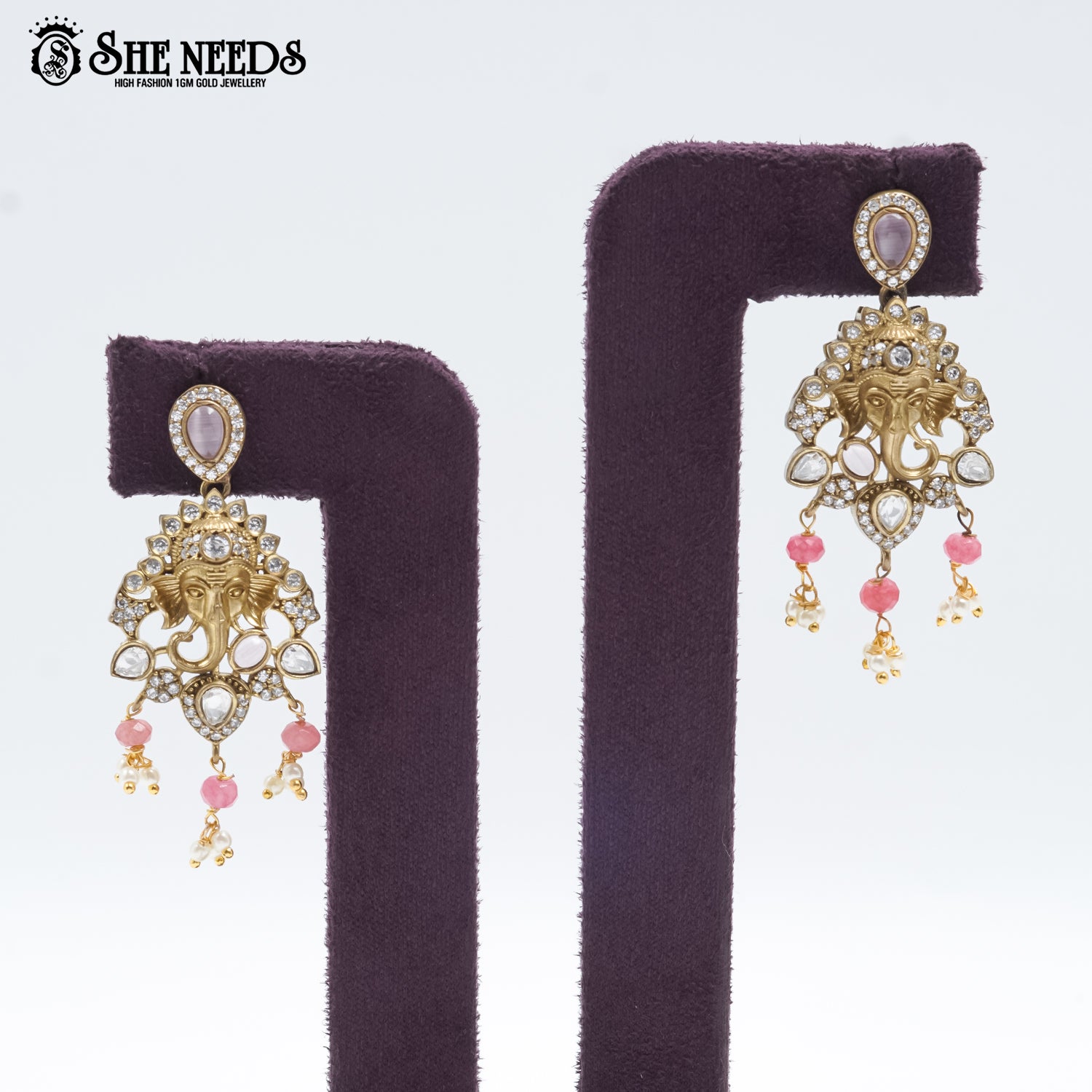 Add divine elegance with the Ganesha Pearl Heritage Earrings. These intricately crafted drops showcase a radiant Ganesha motif with pink and white bead detailing. Ideal for festive occasions or spiritual celebrations.