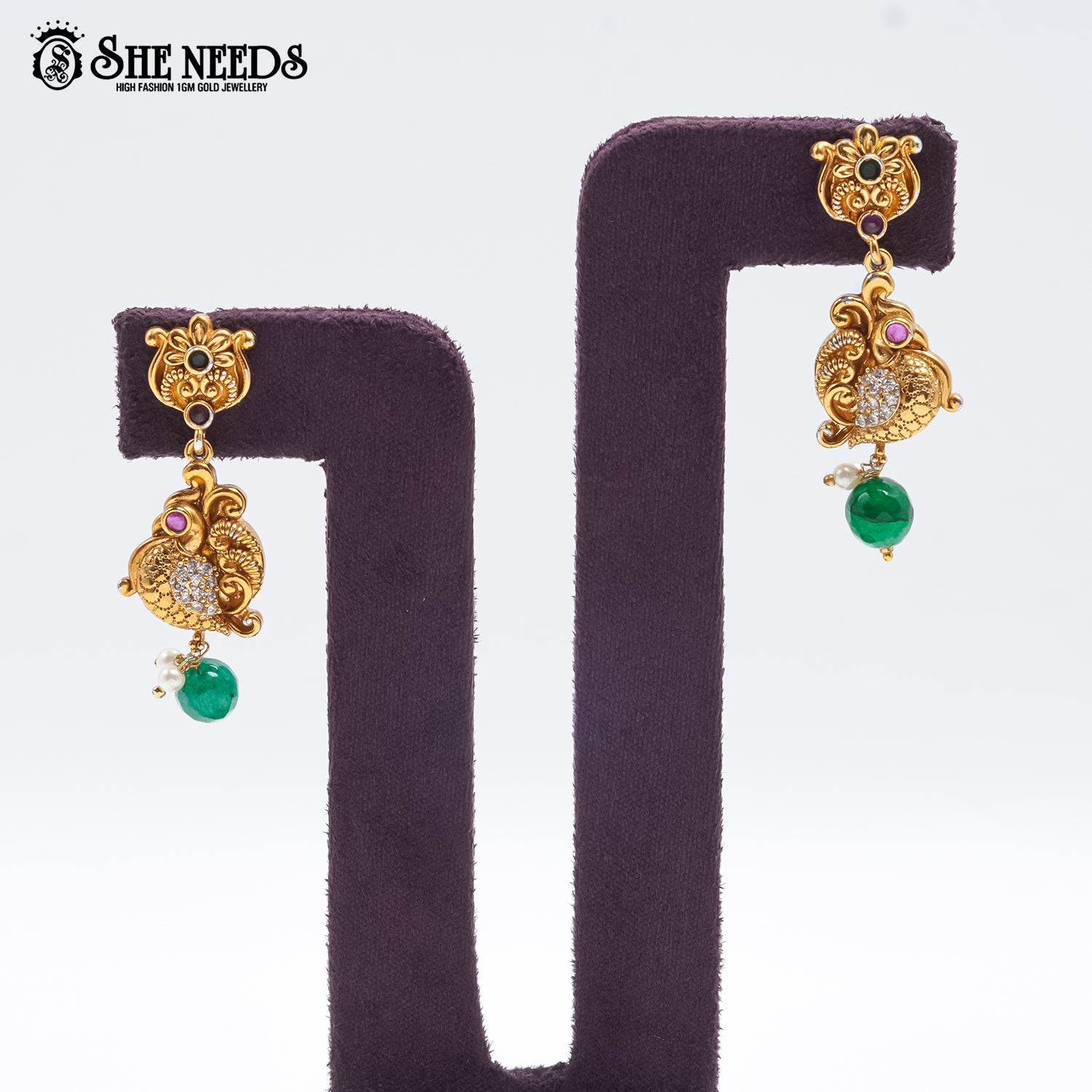Embellished with pearl and green droplet danglers for an ornate finish