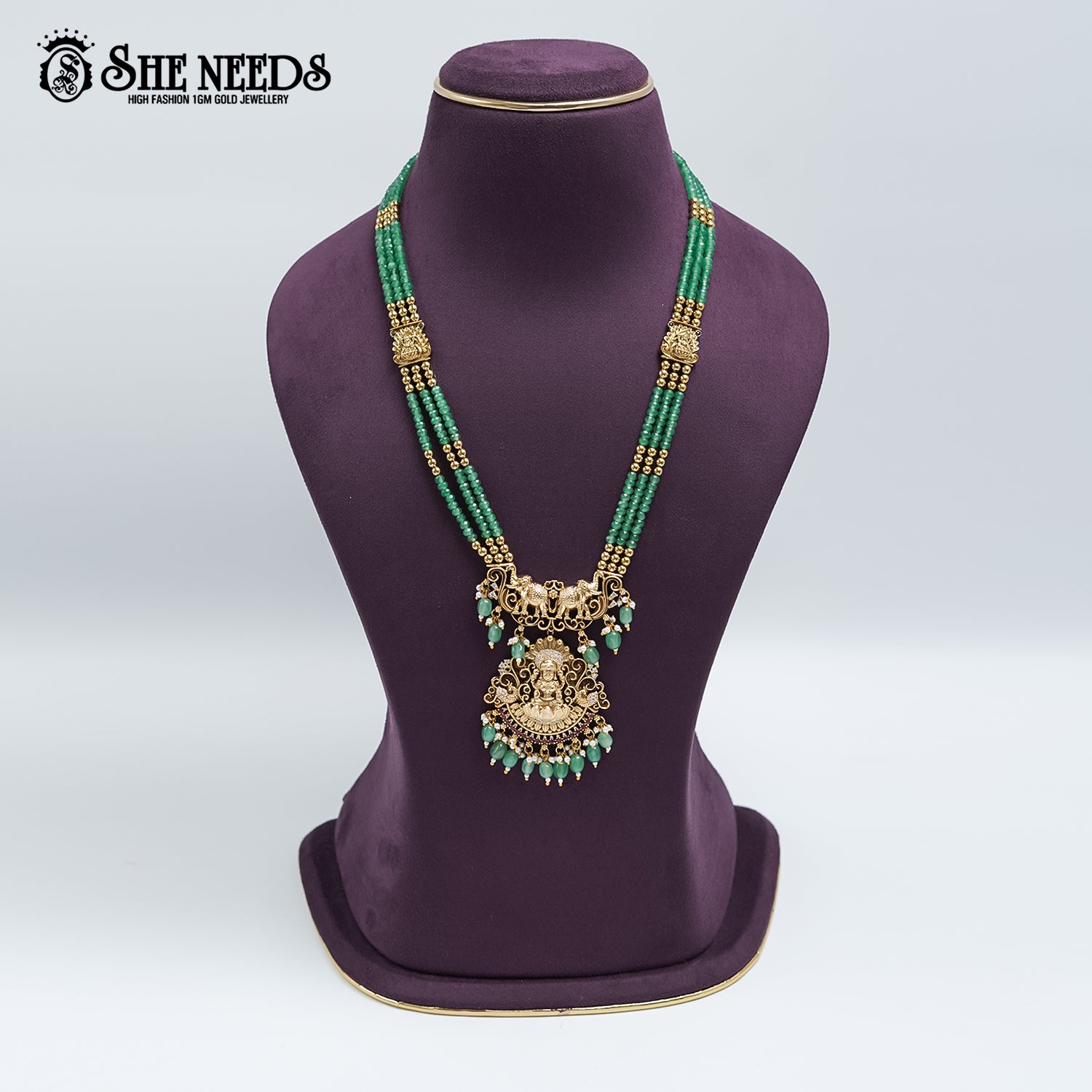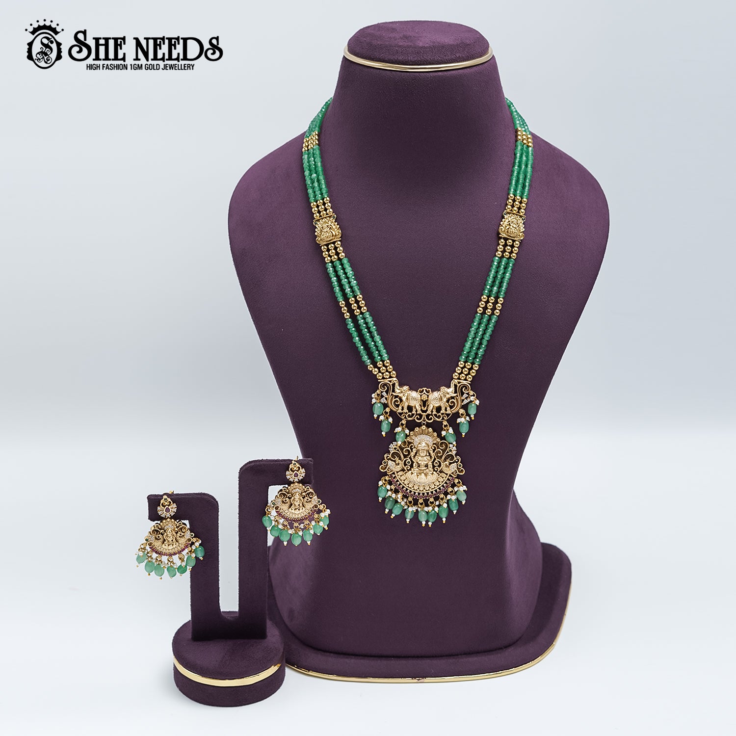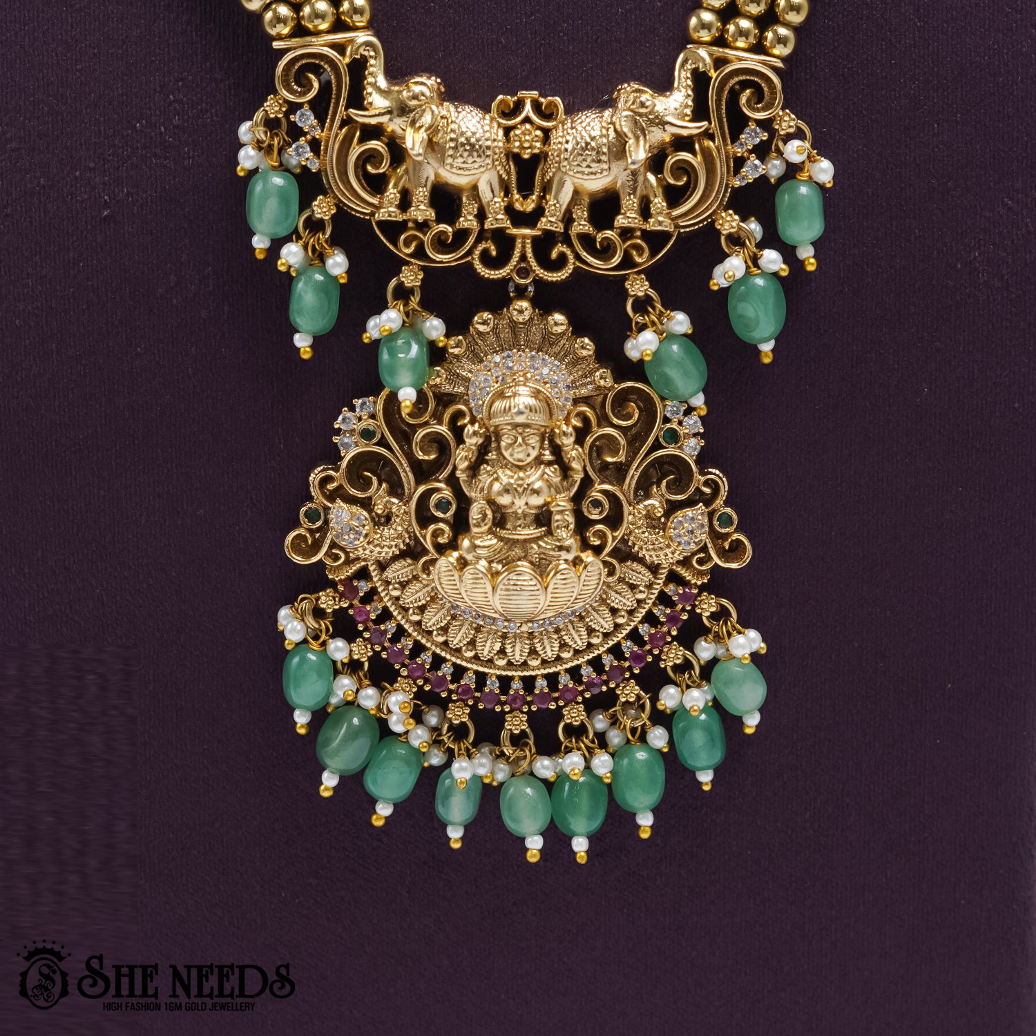 This elegant necklace features a side-set peacock design with rich multi-layer golden chains. Studded with stones and rich green, red, and pearl accents, it embodies the timeless beauty of Indian temple jewelry.