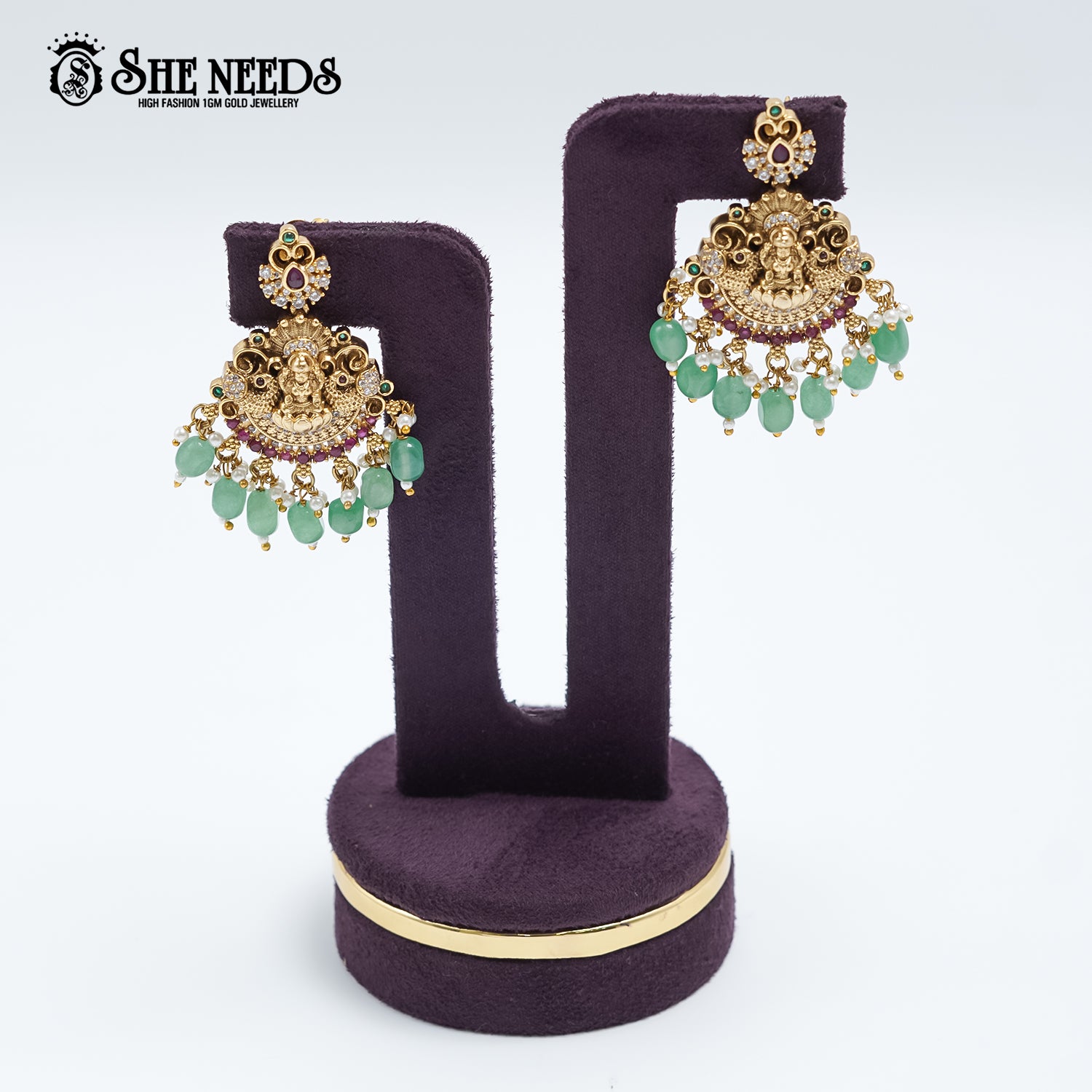 These heritage-inspired jhumkas are adorned with intricate temple carvings of Goddess Lakshmi and peacock motifs. Finished with vibrant green beads and delicate pearl danglers, they make a statement of elegance and tradition.