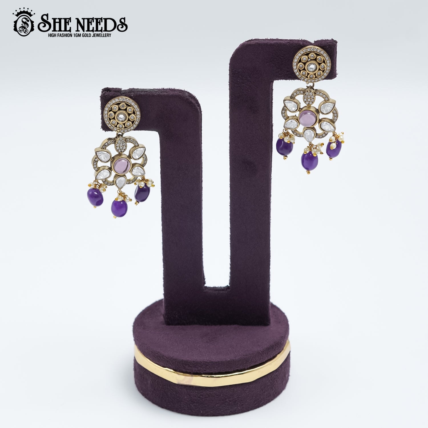Embellished with white stones and purple bead danglers