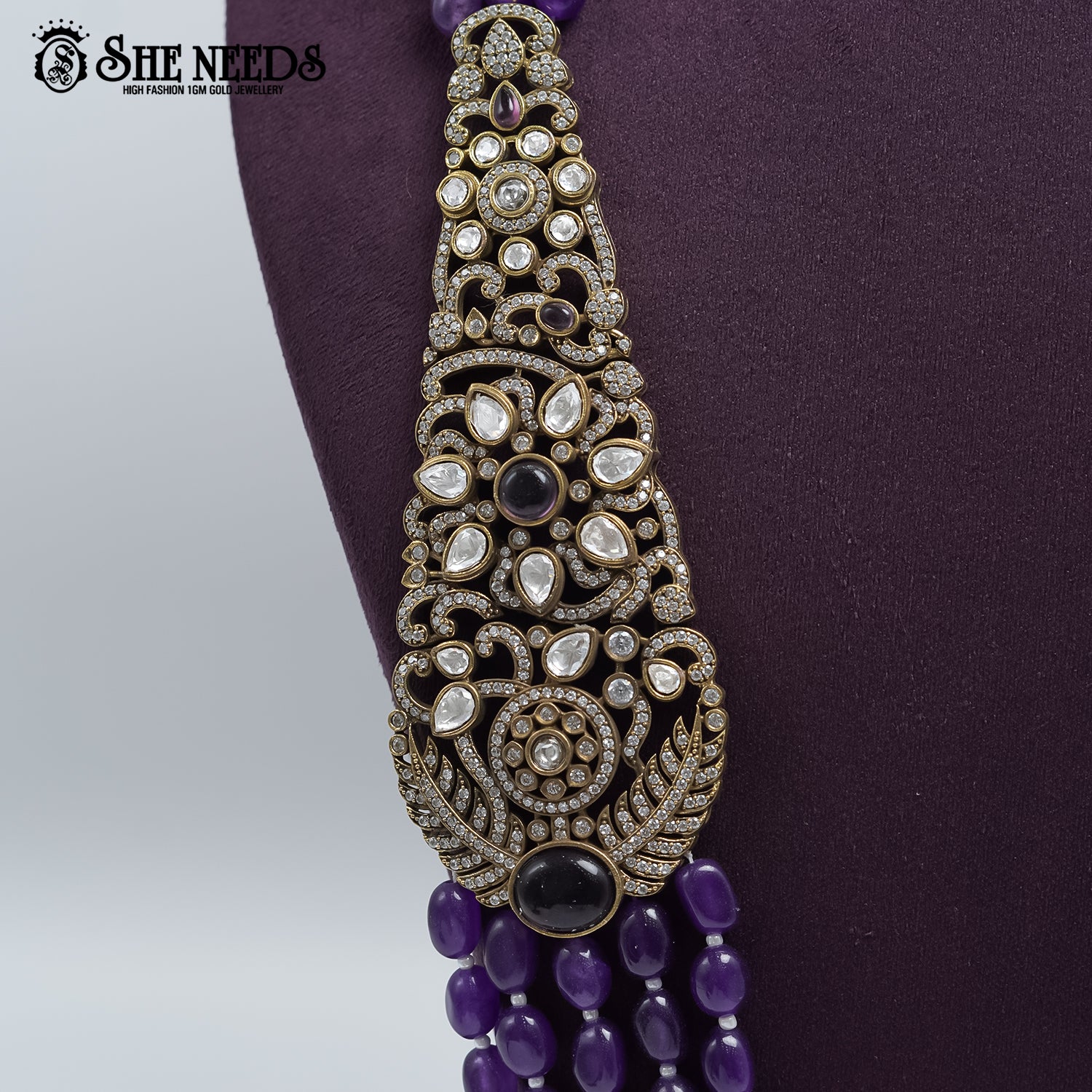 Drape yourself in timeless elegance with this stunning antique-style necklace set. Featuring a grand pair of oxidized silver-tone pendant panels encrusted with dazzling white stones and centered with dark amethyst beads, this piece exudes regal charm. The layered strands of glossy purple beads add a rich pop of color, creating a perfect balance of tradition and boldness. A head-turner for weddings and grand occasions.