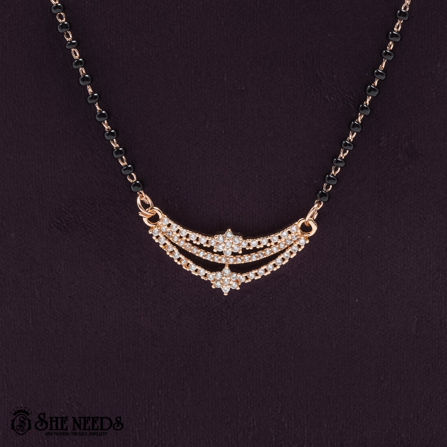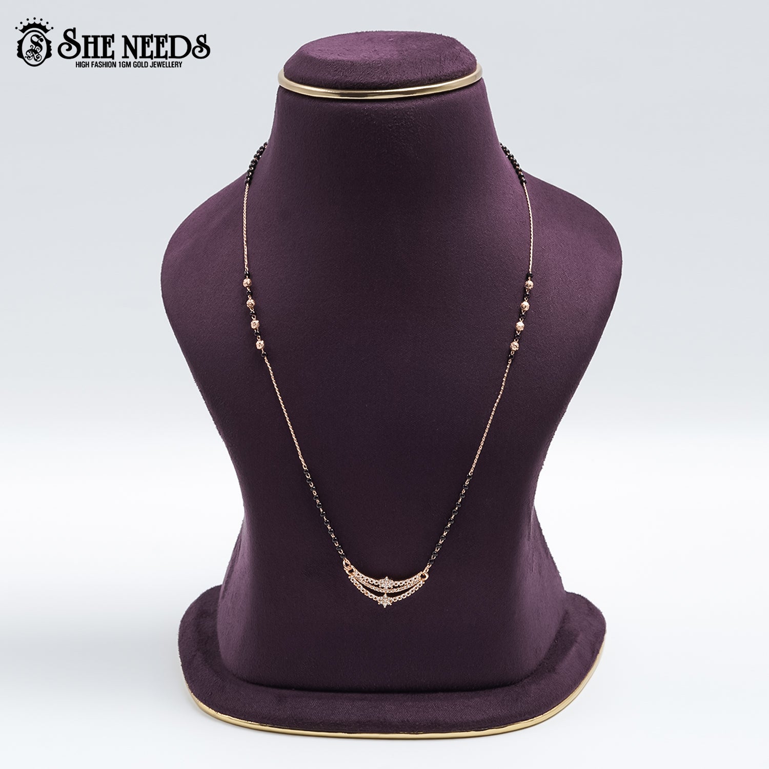 Elevate your style with the Triple Grace Gold Mangalsutra – a perfect blend of grace and glamour. Featuring three delicate arcs encrusted with dazzling stones and finished with star motifs, this piece offers timeless elegance. Its sleek, layered design makes it a versatile addition to both modern and traditional wardrobes.