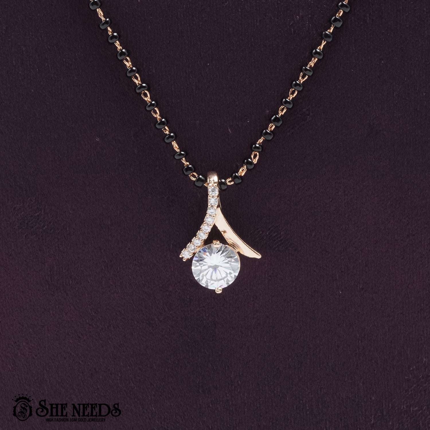 Grace meets minimalism in the Celestial Curve Gold Mangalsutra – a perfect blend of elegance and simplicity. Featuring a sleek curve motif holding a dazzling solitaire-inspired stone, this design brings a modern charm to the traditional symbol of love and commitment. Ideal for the modern woman who prefers understated luxury.