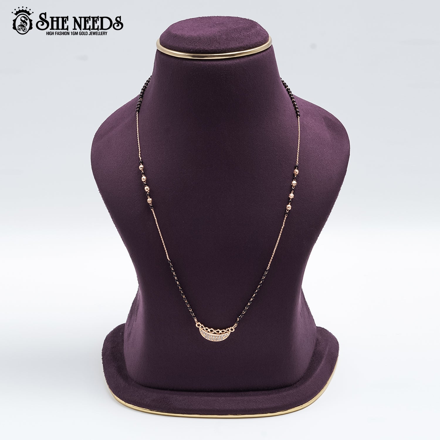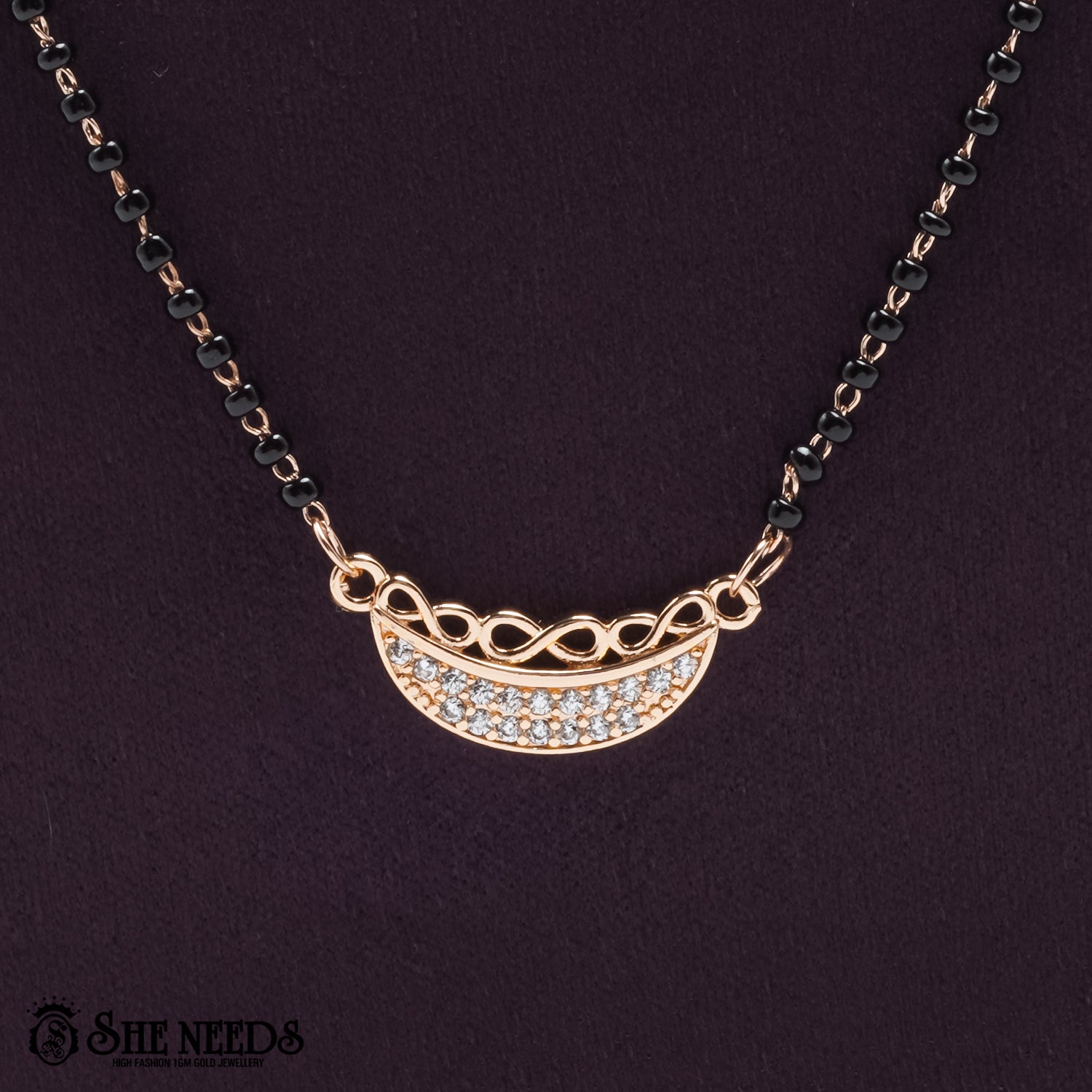 This exquisite half-moon pendant mangalsutra is a stunning combination of modern artistry and traditional charm. Designed with sleek black beads and a sparkling studded pendant, it radiates grace and sophistication. Perfect for both daily wear and special occasions, this lightweight design ensures comfort without compromising elegance.