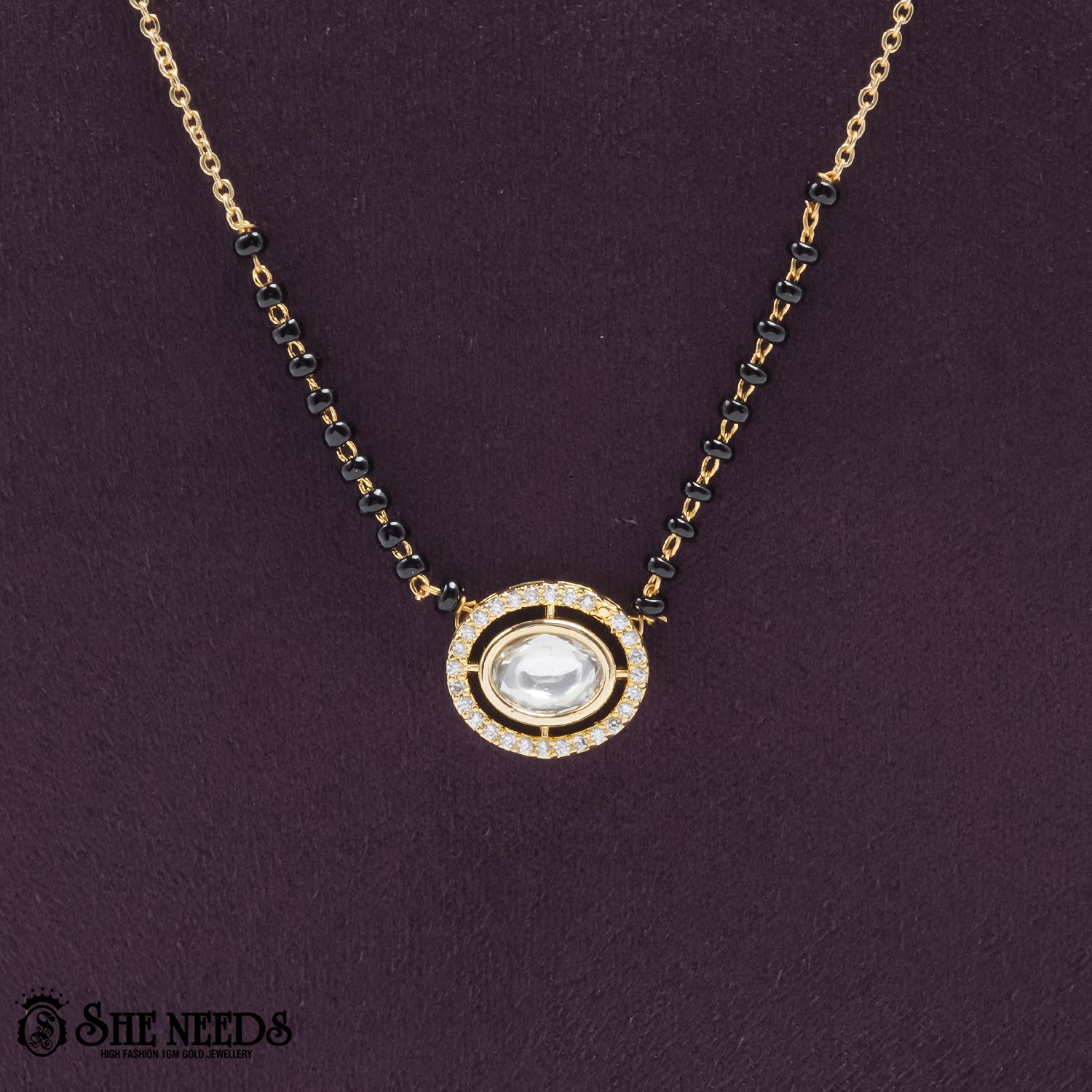 Introducing the Classic Mirror-Glow Mangalsutra — a timeless blend of tradition and brilliance. Highlighted by a radiant oval mirror-cut stone at the center, encased within twin golden halos encrusted with sparkling stones, this piece exudes elegance. Paired with traditional black bead chains, it's an ideal choice for those who appreciate minimal glamour in everyday wear.