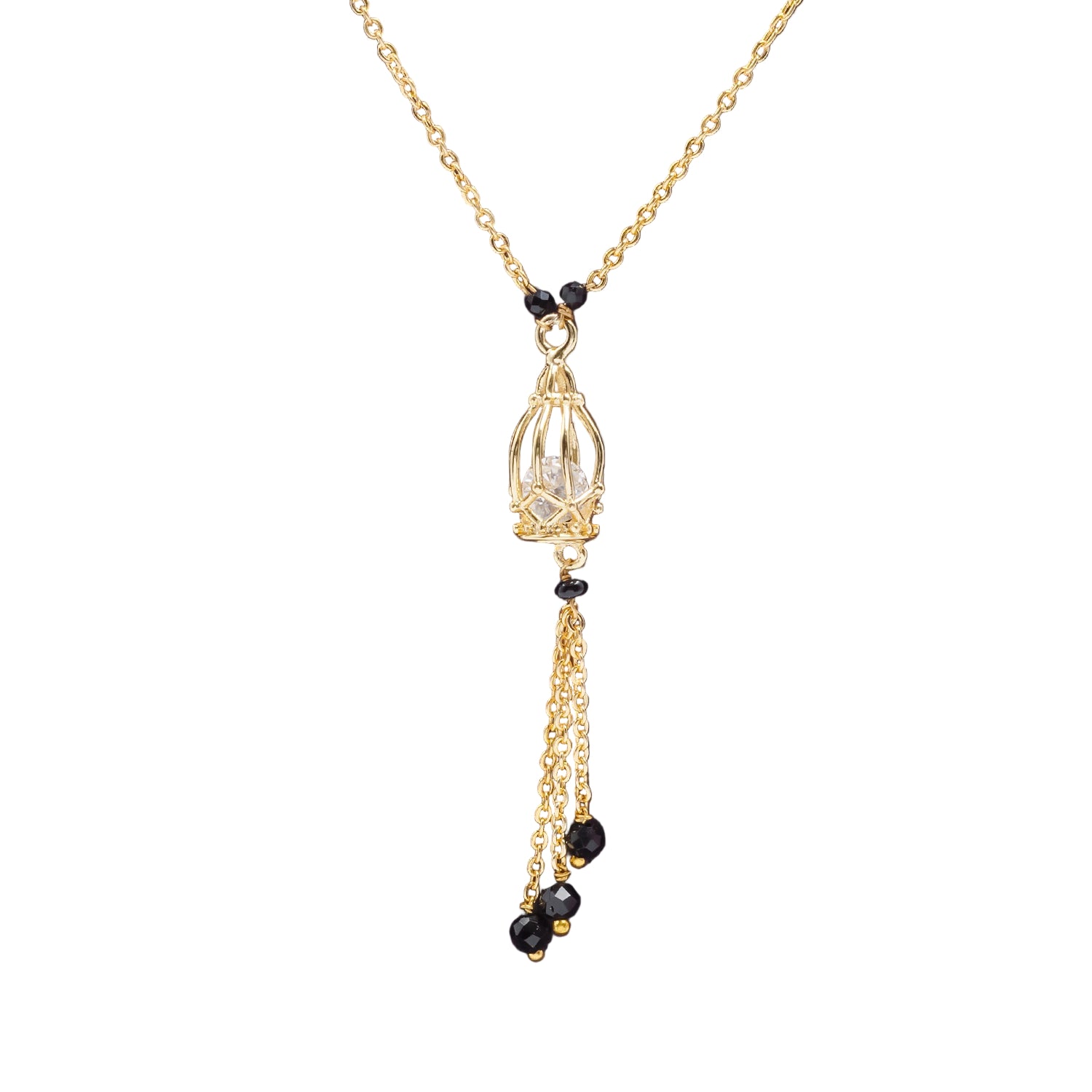 Elevate your ensemble with the Graceful Drop Tassel Mangalsutra. Designed with a distinctive cage-style pendant housing a sparkling stone and adorned with delicate golden tassels, this piece exudes unique charm and refined elegance. Complemented by traditional black beads, this mangalsutra is a statement of grace and modern flair.