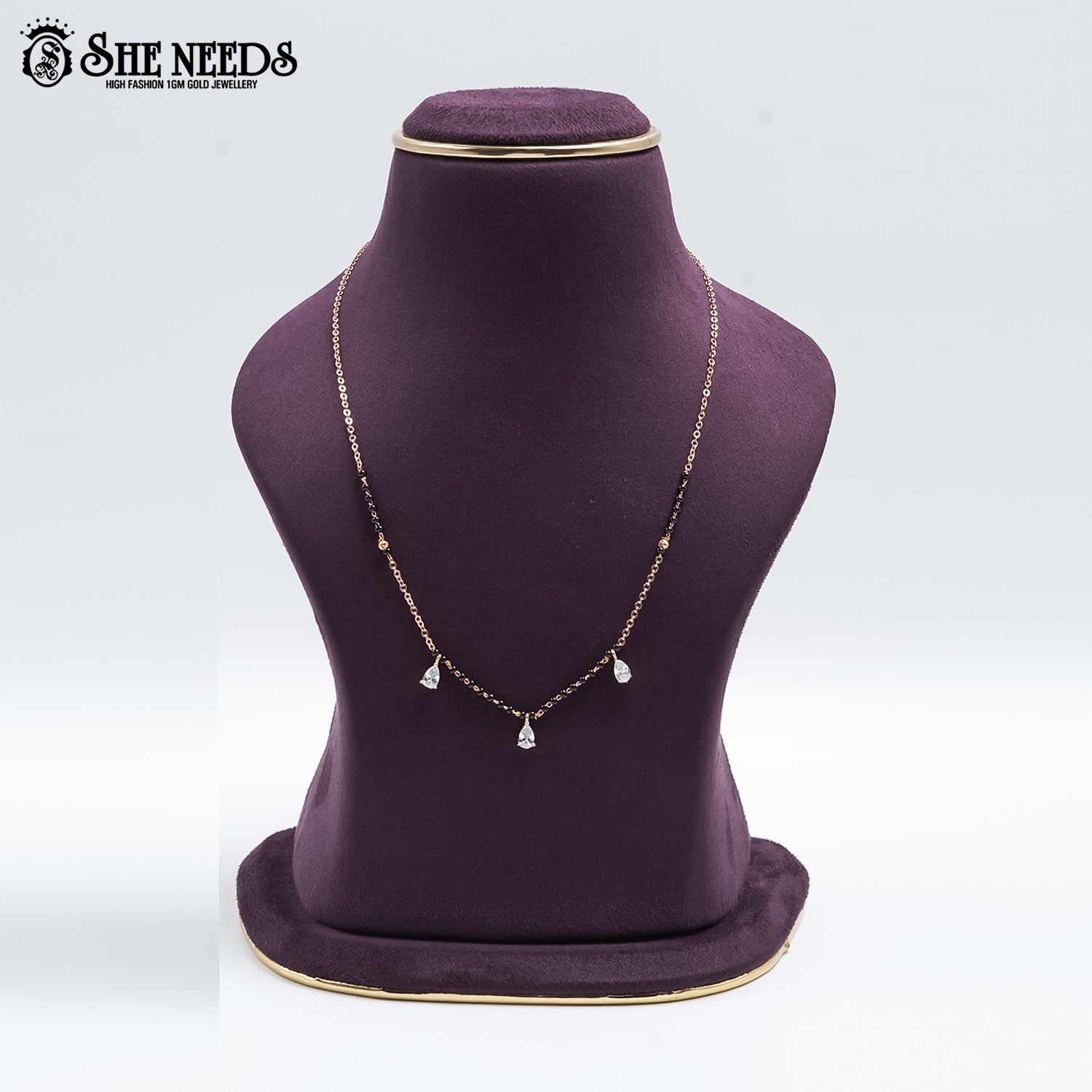 Evoke grace with every step you take wearing the Raindrop Radiance Mangalsutra. This delicate piece features three shimmering teardrop-shaped stones that resemble glistening raindrops—symbolizing purity, renewal, and feminine strength. The traditional black bead chain blends effortlessly with the modern charm of the dangling stones, creating a timeless yet contemporary accessory for daily elegance or festive flair.