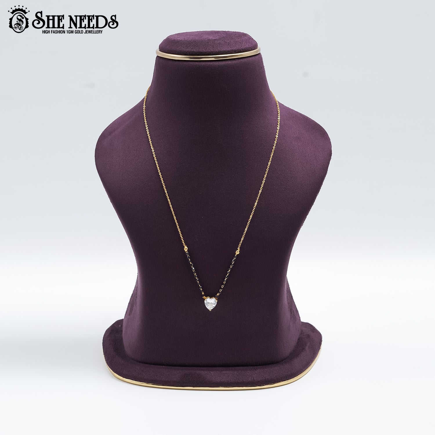 Celebrate love in its purest form with the Heartfelt Harmony Mangalsutra. This elegant piece features a striking heart-shaped stone at its center—an eternal emblem of love and devotion. Paired with the traditional black bead chain and accented by a gleaming gold-plated finish, this mangalsutra blends cultural depth with modern sophistication, making it a perfect choice for daily wear or meaningful moments.