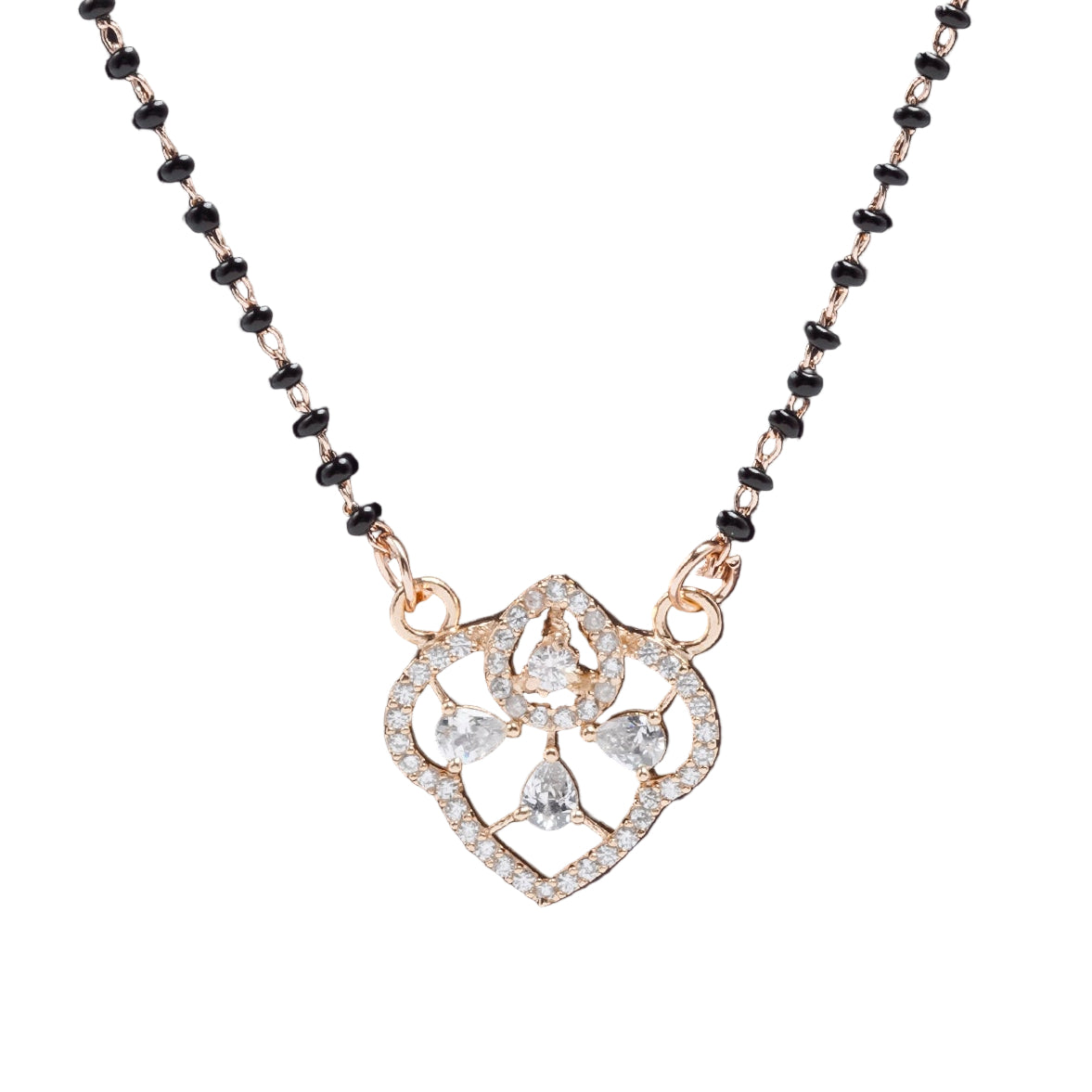 Celebrate timeless love with the Eternal Bloom Mangalsutra, a symbol of elegance and devotion. Its stunning heart-shaped floral pendant, encrusted with shimmering stones, radiates charm and sophistication. Paired with a classic string of black beads, this mangalsutra is a graceful union of tradition and style—perfect for the modern woman who cherishes meaningful beauty.