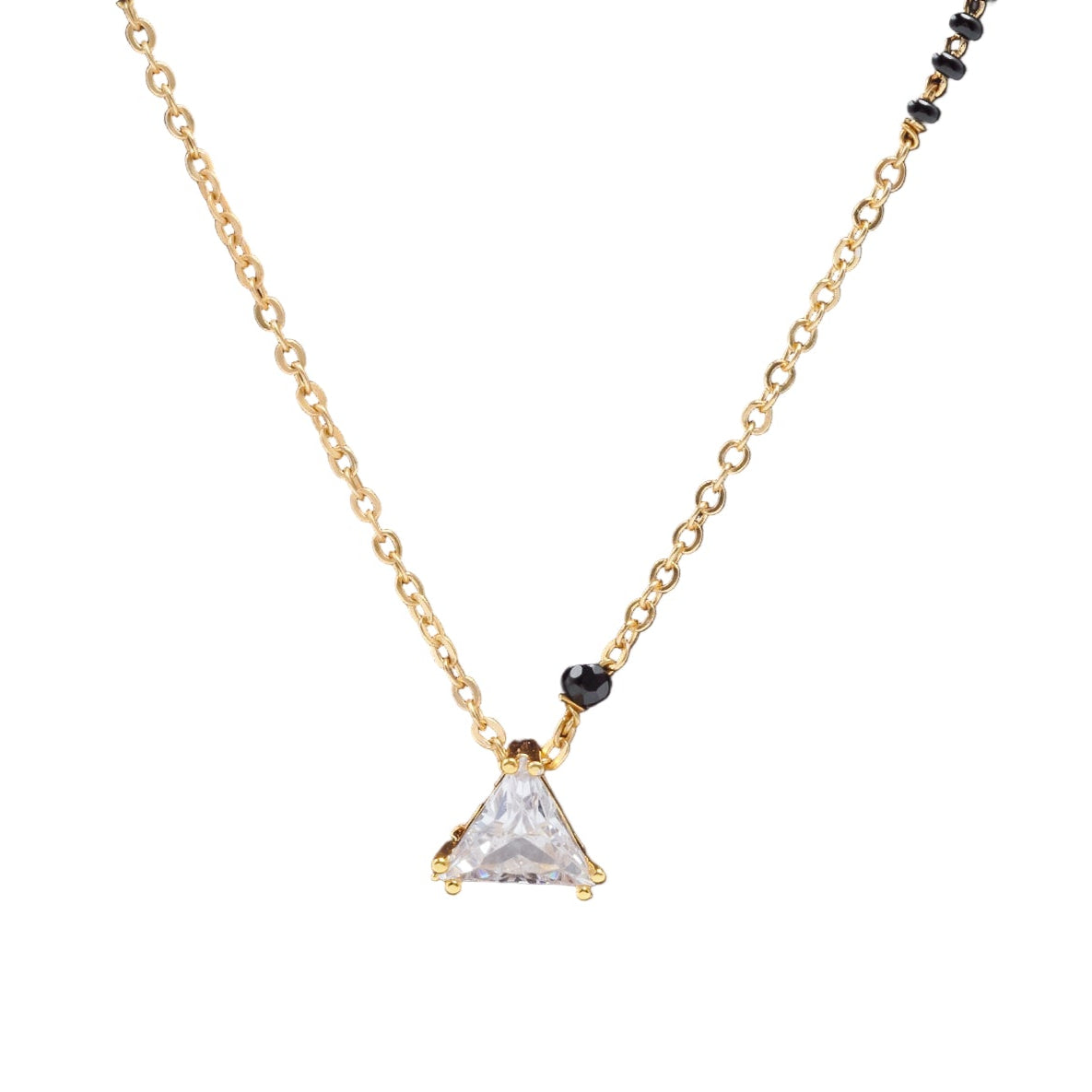 Chic and symbolic, the Trilliant Spark Mangalsutra is where geometric beauty meets timeless tradition. Featuring a brilliant trilliant-cut stone suspended from a delicate gold-toned chain accented with classic black beads, this piece embodies grace with modern minimalism. Ideal for women who appreciate understated elegance with cultural roots, it’s perfect for both daily wear and special moments.