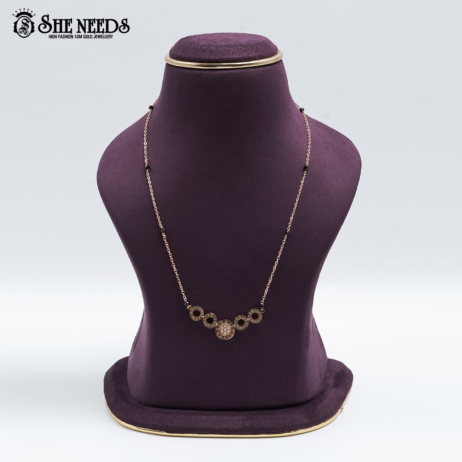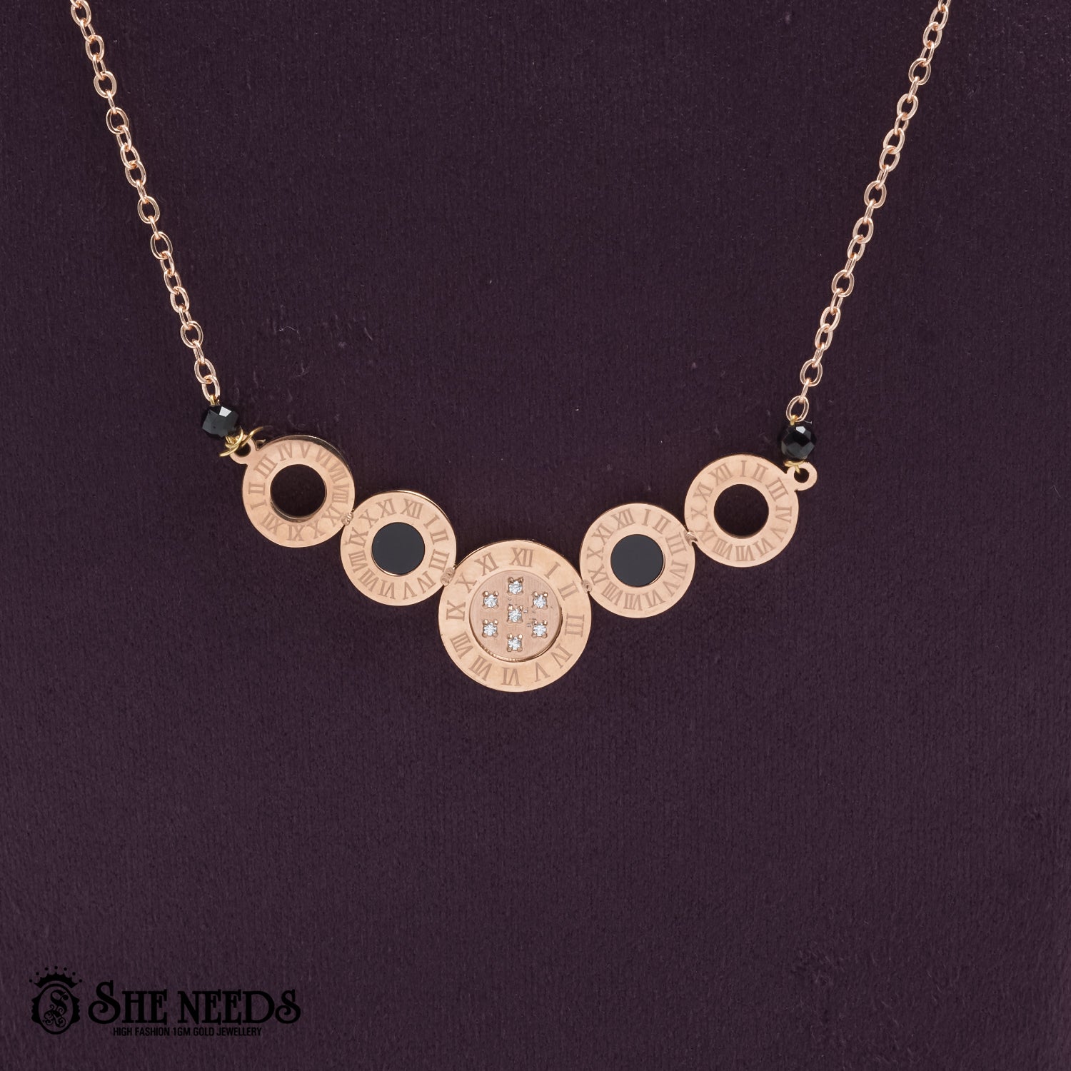 This unique necklace showcases an elegant sequence of circular Roman numeral charms, perfectly blending modern style with timeless appeal. Crafted with a high-quality 1GM gold finish, it features delicate black detailing and a center charm adorned with sparkling stones—making it ideal for special occasions or a statement piece for everyday wear.