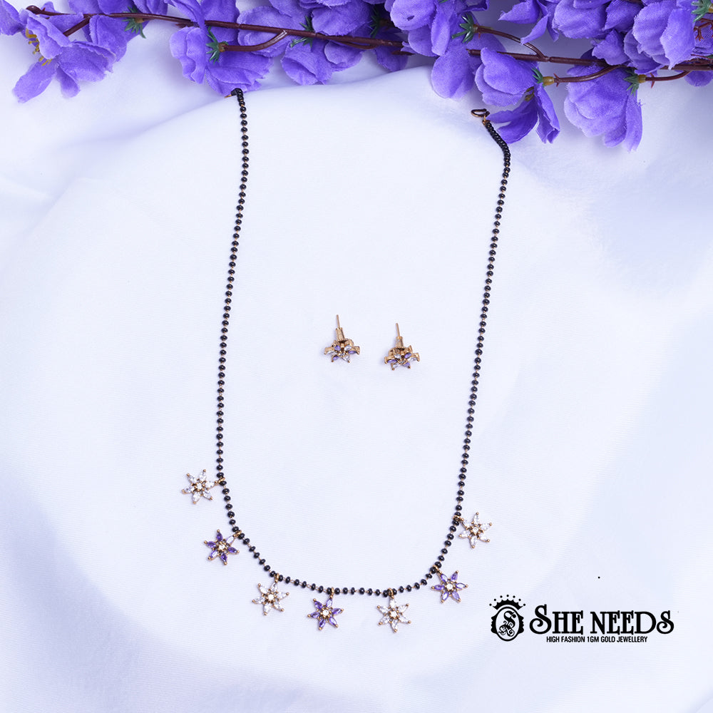 This mangalsutra features a graceful black-bead chain highlighted by golden floral pendants. Each pendant forms a radiant flower with six petals, alternating between amethyst purple and sparkling white marquise stones, centered with a round CZ accent. The set blends ethereal charm with modern style, perfect for festive celebrations and daily elegance.