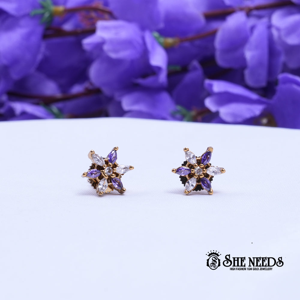 Coordinated stud earrings shaped into a six-petal flower motif, showcasing a mix of amethyst purple and sparkling white marquise stones around a brilliant central stone. These versatile, lightweight studs add a lively yet classy touch to both everyday and festive looks.