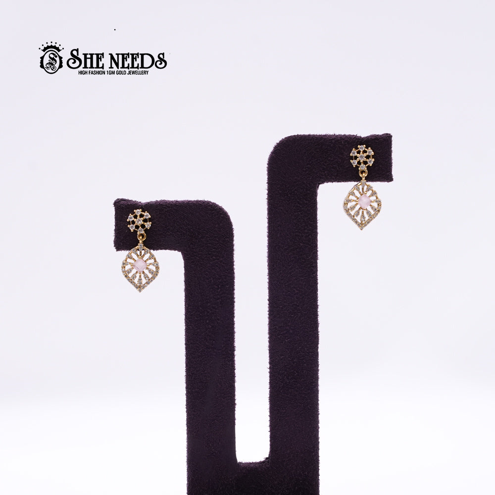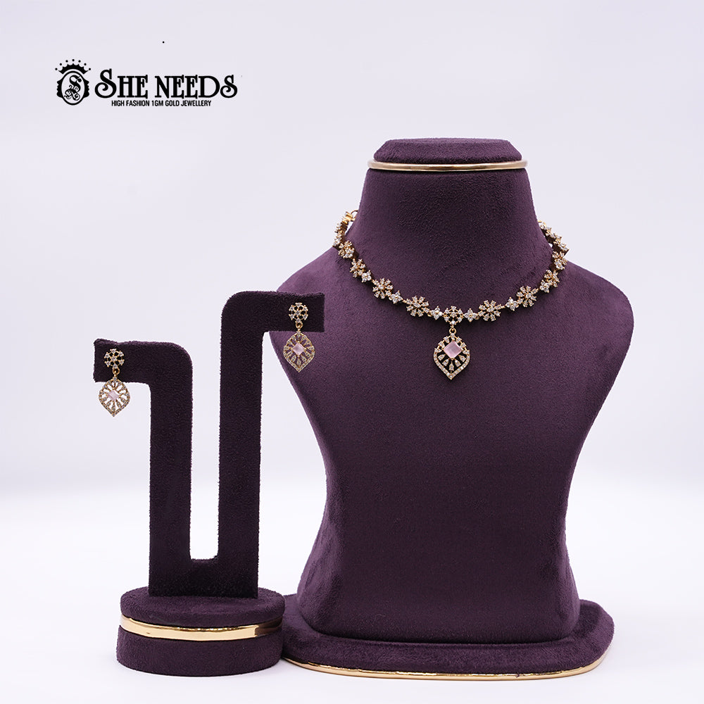Add a gentle feminine touch to your ethnic look with the Blush Radiance Pendant Necklace Set from She Needs. This necklace features a graceful floral vine chain adorned with brilliant American diamonds, culminating in a soft blush-pink stone pendant framed in a leaf-inspired design. The warm gold plating and intricate craftsmanship make it an enchanting choice for weddings, festive gatherings, and elegant evenings.