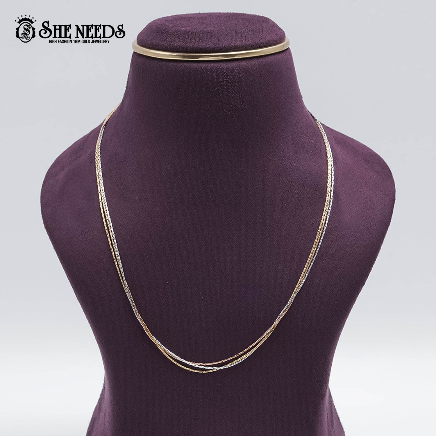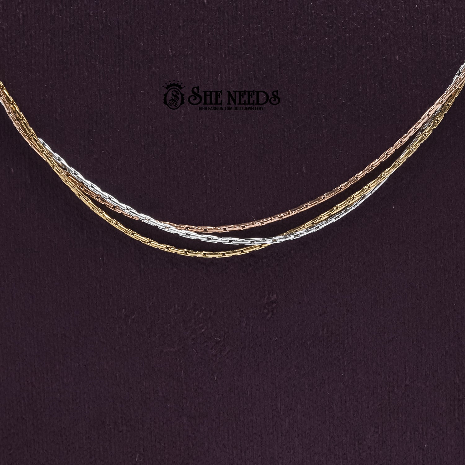 Elevate your look with this exquisite triple-tone layered gold chain. Featuring a harmonious blend of gold, rose gold, and silver finishes, this elegant piece offers a versatile and modern aesthetic. Perfect for day-to-night transitions, this chain delivers a refined touch to any outfit while staying lightweight and skin-friendly.