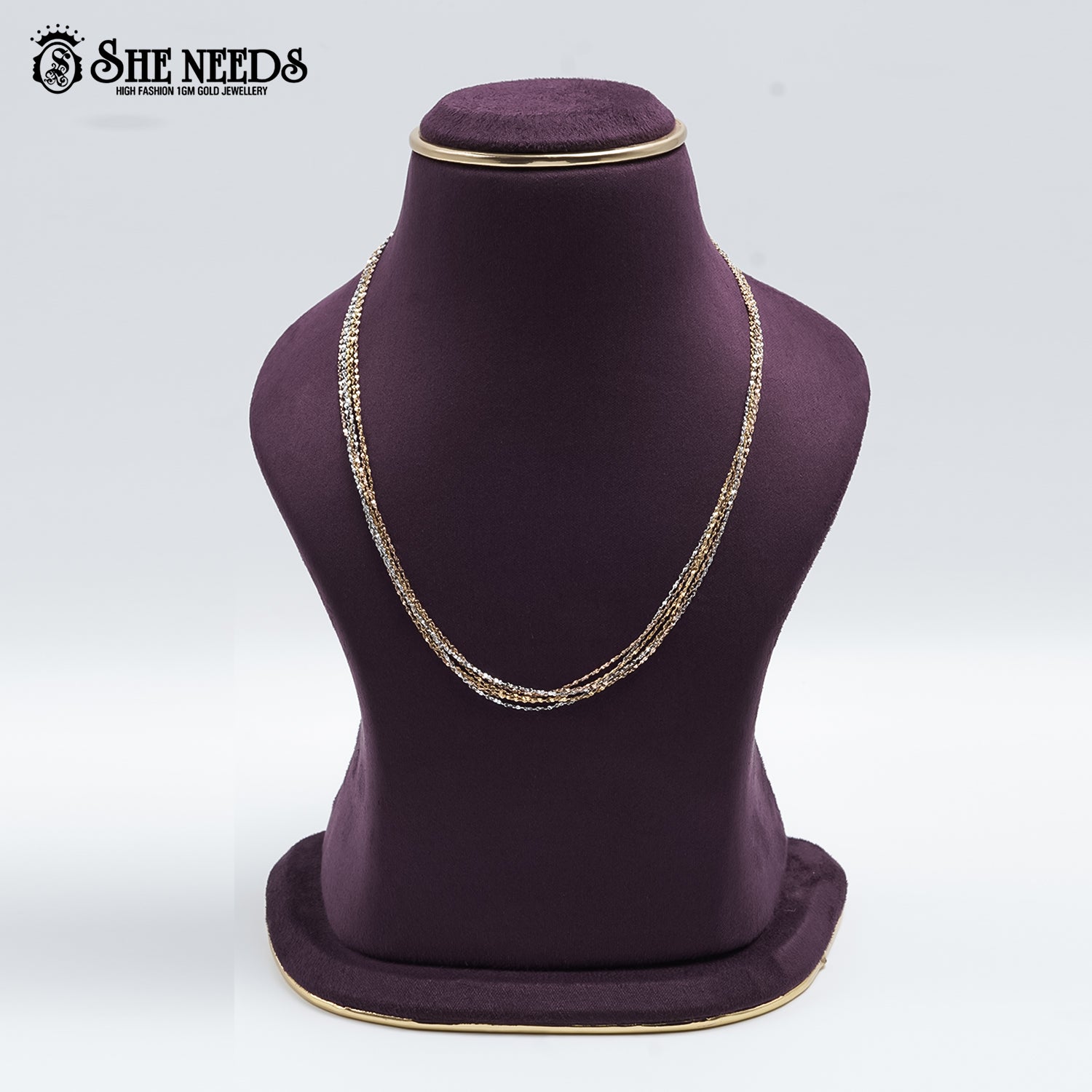 Add a touch of sophistication with the Dual Tone Layered Gold Chain, crafted to perfection with interwoven golden and silver-toned links. Its sleek layered design exudes elegance, making it a versatile accessory for both casual outfits and festive occasions. With a premium 1GM gold finish, this chain ensures lightweight comfort while giving you a luxurious, modern look.