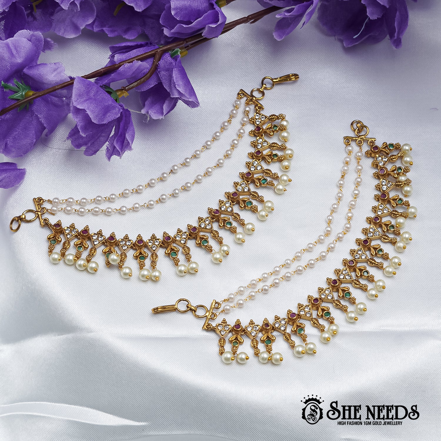 Radiating elegance, the Enchanting Lotus Pearl Payal is a masterpiece in 1gm gold finish. Adorned with intricate lotus-shaped motifs, sparkling white stones, and colored gems, it is beautifully enhanced with pearl drops. The dual pearl chain adds a touch of sophistication, making it the perfect blend of tradition and charm.
