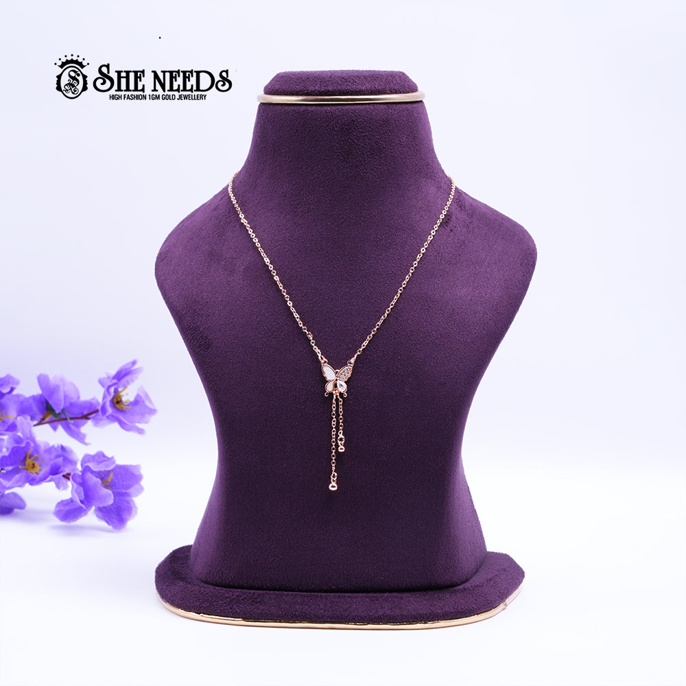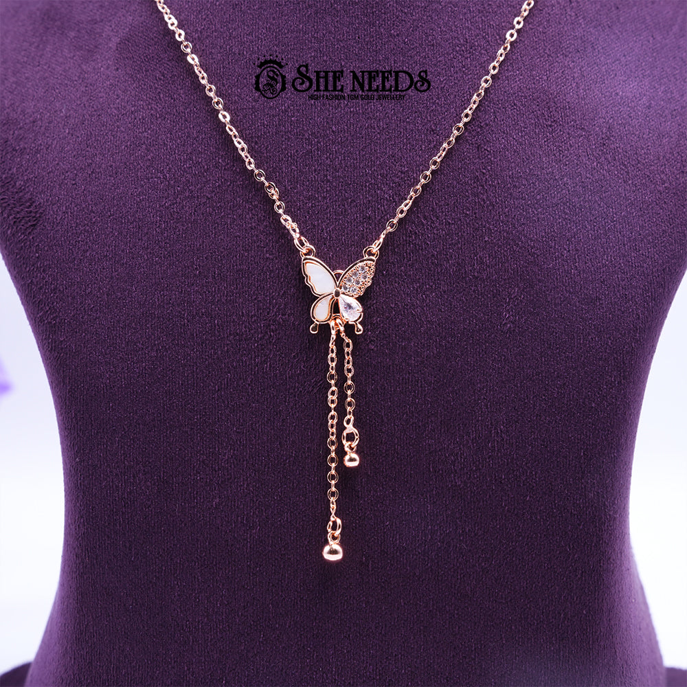A whimsical rose gold necklace featuring a delicate butterfly pendant with mother-of-pearl and crystal accents, finished with twin adjustable chain drops. This chic and modern piece gracefully adds movement and shine to any outfit.