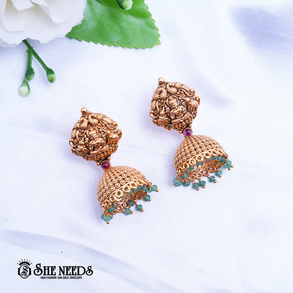- Features: Detailed Lakshmi idol pendant, hand-embossed paisley charms, green and magenta bead hangings, carved deity motifs on earrings