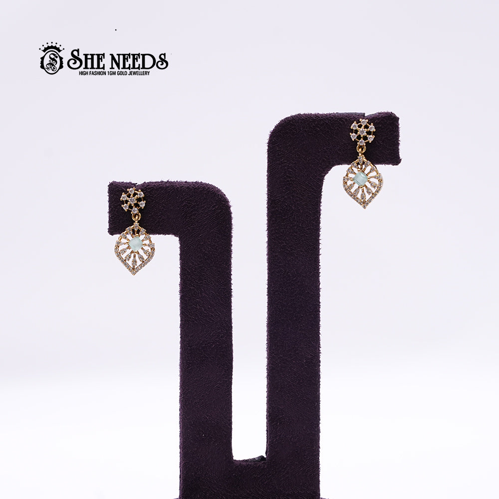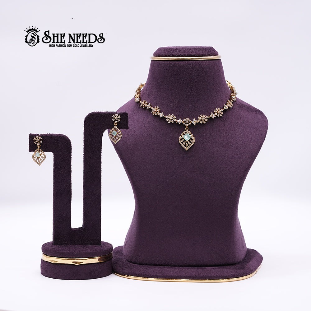 Introducing the Crystal Bloom Pendant Necklace Set from She Needs—a timeless piece that captures the allure of blooming florals with an icy twist. The necklace features a beautiful floral vine chain design, leading to a radiant diamond-shaped pendant adorned with a soft, light blue crystal at its center. The 1gm gold-plated finish adds richness, while the delicate craftsmanship ensures sophistication at every glance.