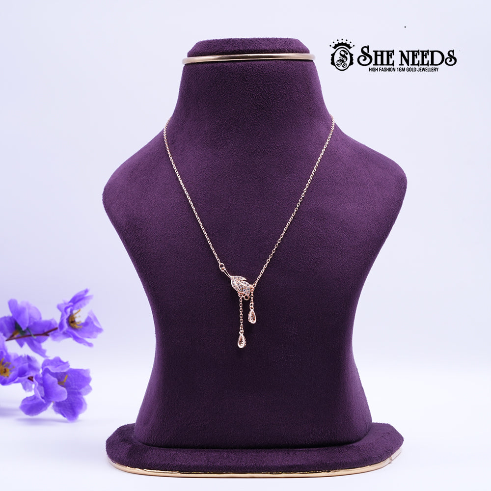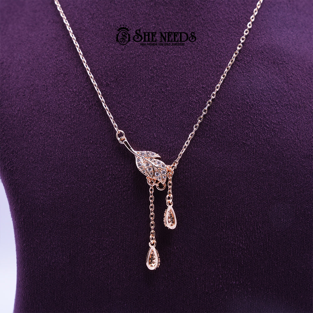 An elegant necklace with a delicate leaf-shaped motif adorned in sparkling stones and graceful drop chain accents, adding a touch of refined sophistication to any outfit. Perfect for occasions where style meets subtle elegance.
