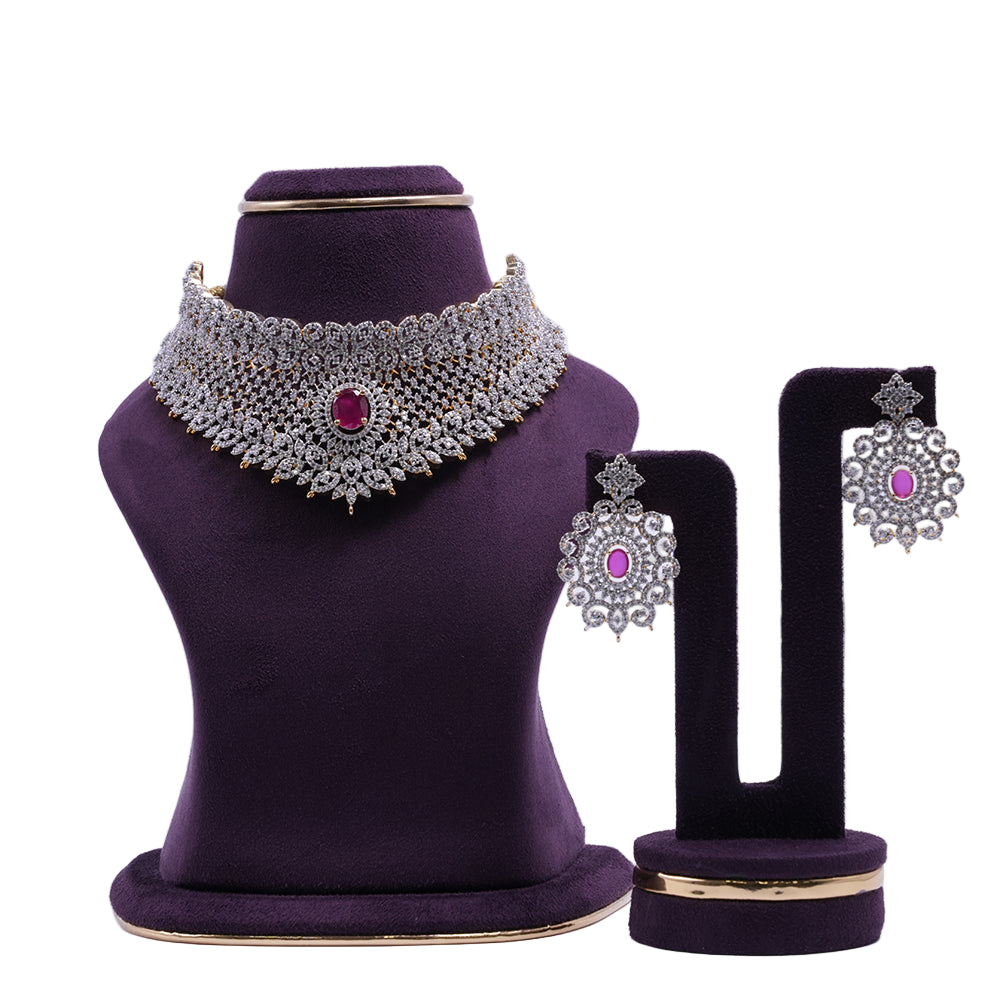 The Ruby Blossom Royale Necklace Set is a striking ensemble that blends timeless elegance with modern grandeur. Featuring a choker-style necklace encrusted with shimmering white crystals and highlighted by radiant ruby stones, this set exudes a rich and regal aura. Perfect for weddings, festive gatherings, and celebratory occasions, it is crafted to leave a lasting impression with its bold yet refined charm.