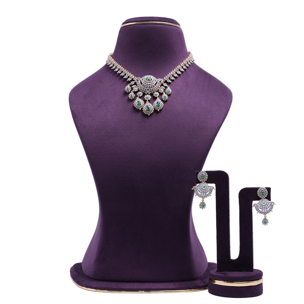 The Royal Emerald Radiance Necklace Set is a true symbol of sophistication and timeless beauty. Designed with sparkling white stones and deep green emerald accents, this set is perfect for weddings, festive occasions, and grand celebrations. Its layered symmetrical design enhances your neckline and adds a regal touch to your ethnic look.