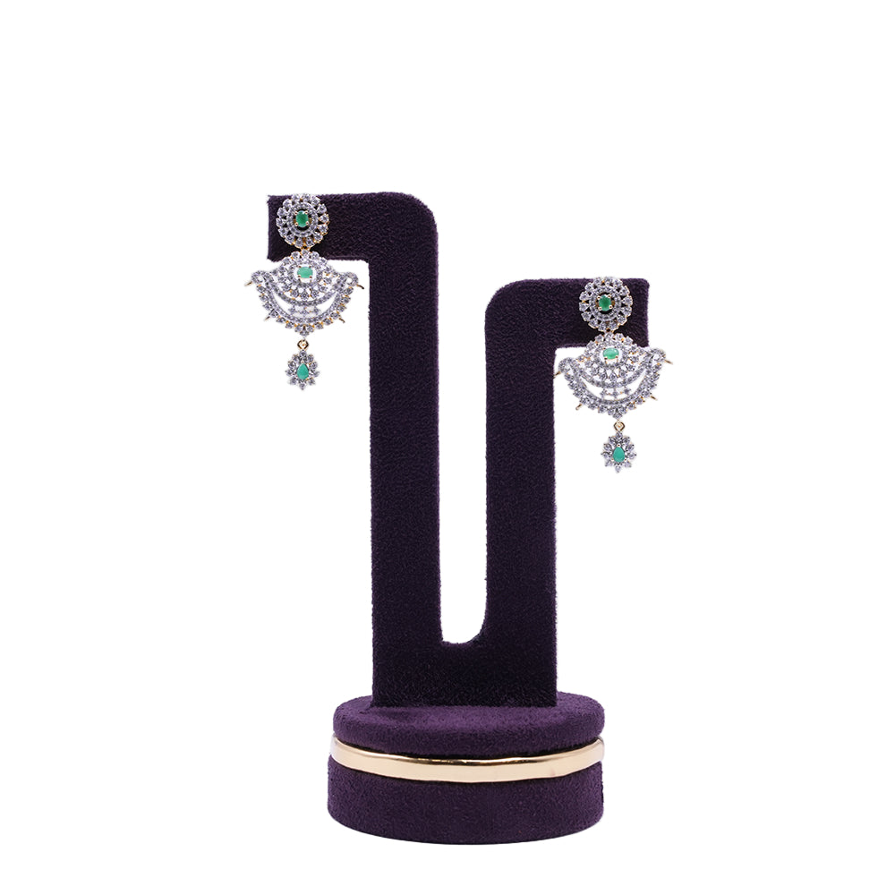 The Royal Emerald Radiance Drop Earrings are designed to complement the necklace set with grace and elegance. Featuring a fan-shaped layered design with brilliant white stones and striking emerald highlights, these earrings make a statement whether worn alone or as part of the set.