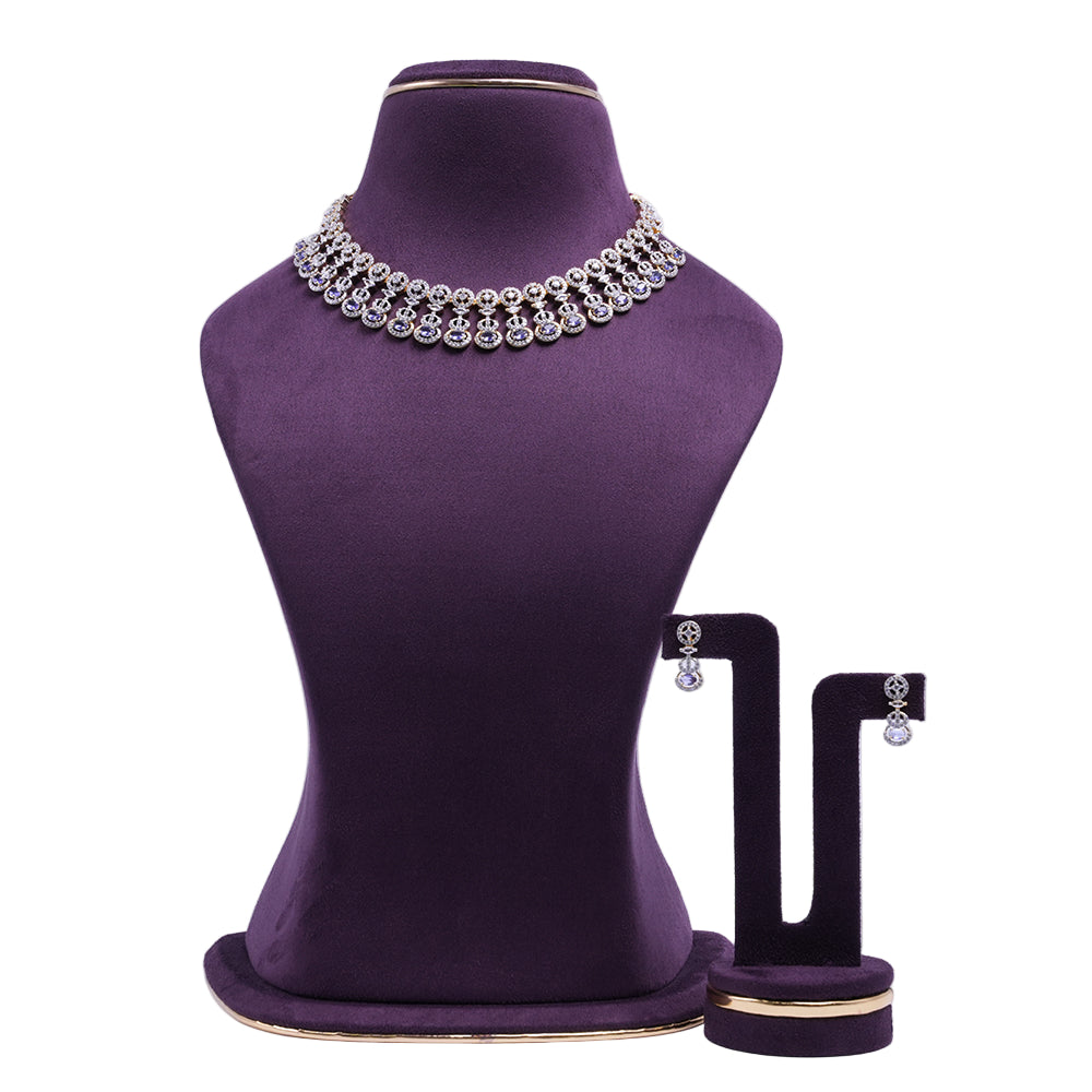 The Radiant Circle Charm Necklace Set is a dazzling expression of grace and luxury. Crafted with a layered choker-style design, it features intricate circular motifs, each encrusted with sparkling white stones for unmatched brilliance. Delicate drop-shaped accents hang gracefully, adding depth and movement to this stunning piece. Lightweight yet regal, this necklace is an ideal choice for weddings, evening parties, and festive occasions where elegance is key.