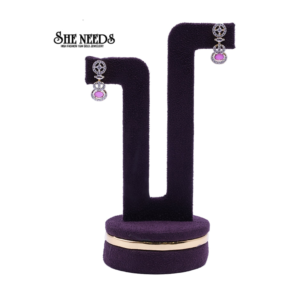 The Regal Blossom Drop Earrings are a graceful companion to the necklace, designed to add charm whether worn alone or as part of the set. Each earring features a detailed floral motif adorned with sparkling white stones and a striking pink drop accent, creating a look that is both elegant and eye-catching. Lightweight and versatile, these earrings are a must-have accessory for festive wear or evening elegance.