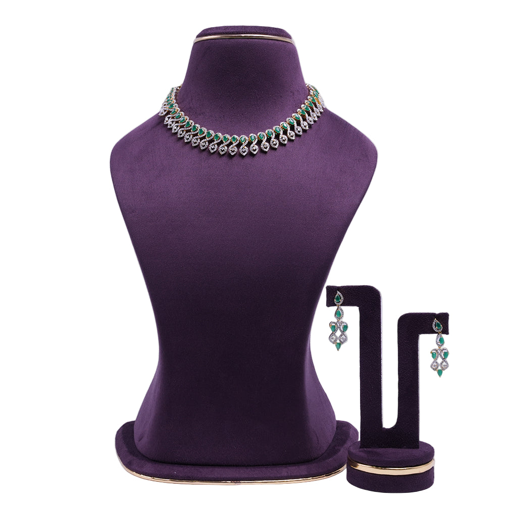 The Emerald Grace Choker Necklace Set is a timeless symbol of elegance and poise. Featuring a delicate choker-style design, this necklace is adorned with radiant green stones framed by dazzling white accents, creating a rich, luxurious appeal. The intricate detailing and lightweight construction make it a versatile choice for weddings, festive occasions, and evening celebrations, ensuring you shine with effortless grace.